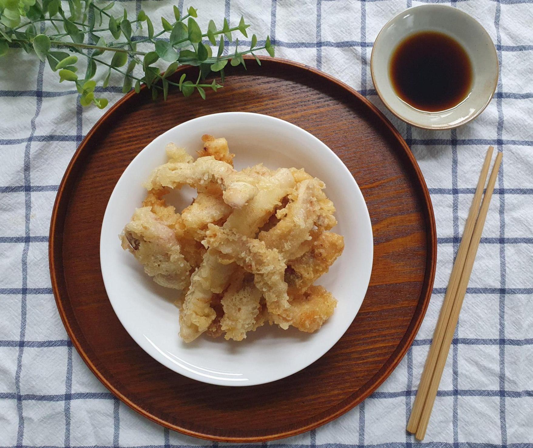 기름이 잘 빠져 담백하게 먹을 수 있는 오징어 튀김이 완성되었습니다. ^^ 바삭바삭한 식감이 참 좋은 오징어 튀김.