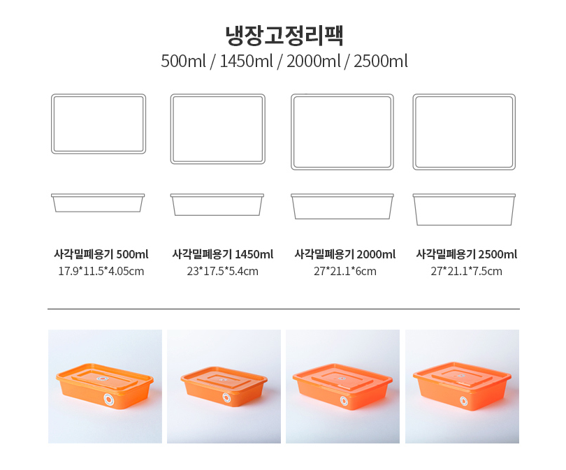 냉장고 정리 팩은 4종으로 구성되어 있습니다. 500ML / 1450ML / 2000ML / 2500ML 총 4가지 종류로 준비할 수 있는 세트 구성인데요. 큼지막하니 활용도가 좋을 것 같습니다.