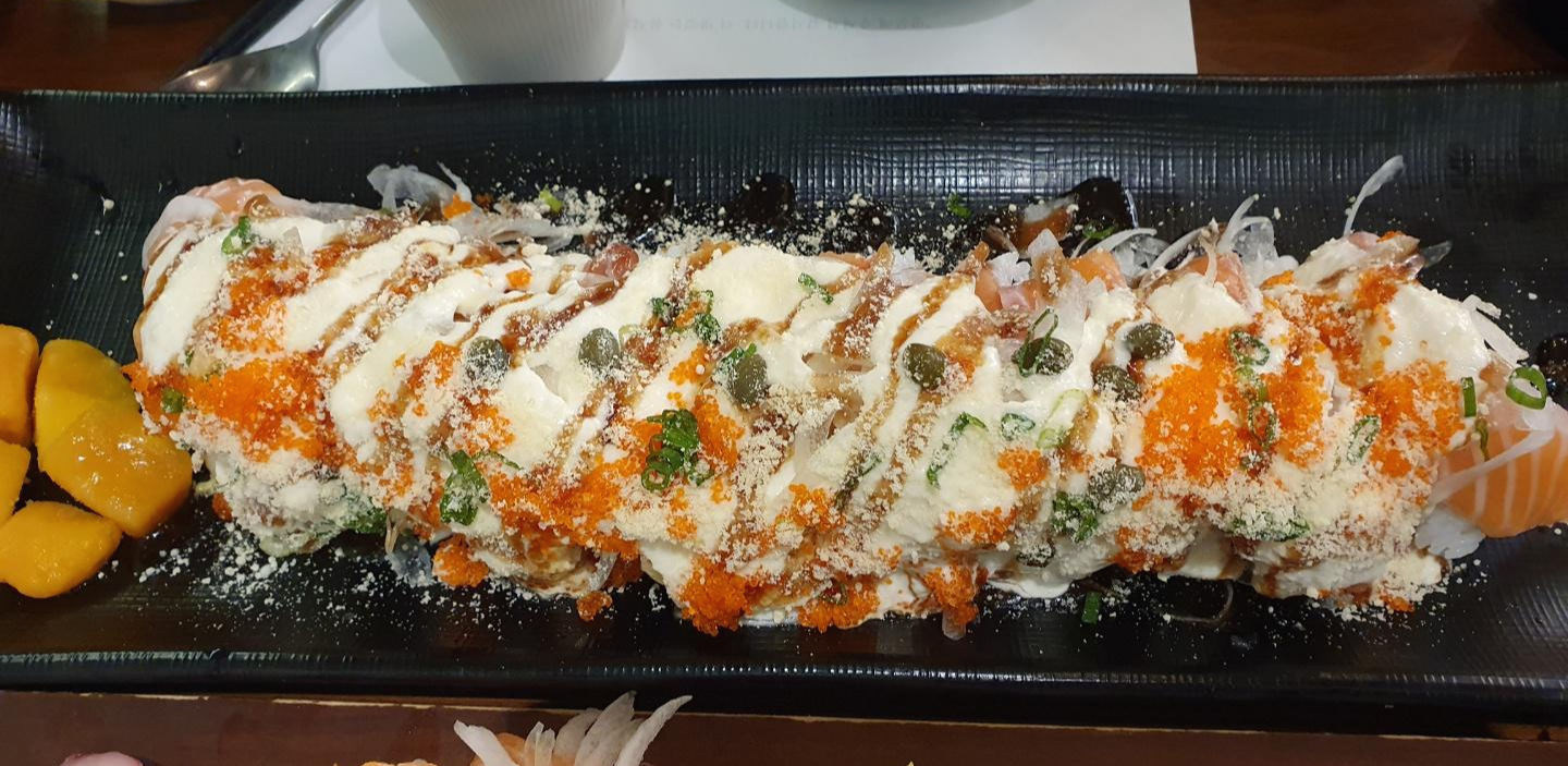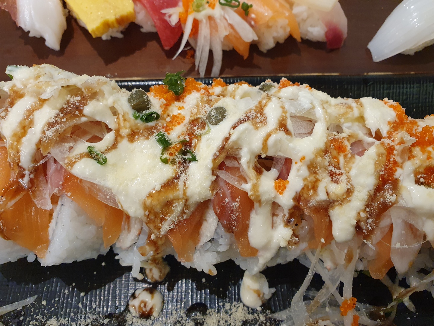 연어롤 비주얼 봐주세요. 와... 롤 위에 연어가 듬뿍 올라가있고 크림소스인지 소스와 날치알 양파들이 엄청 올라가 있습니다.