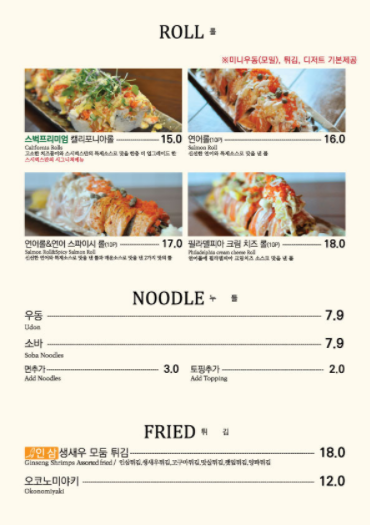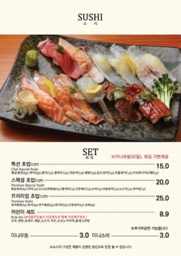 메뉴판에도 적혀 있지만, 튀김 / 미니우동 / 디저트는 기본 제공으로 특선초밥과 ROLL류는 모두 포함되는 사항입니다.