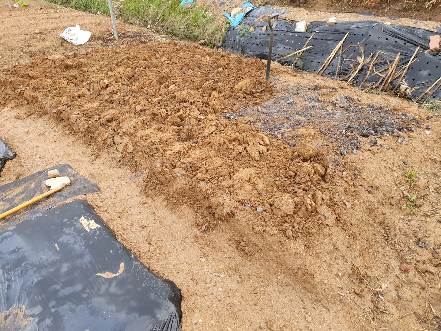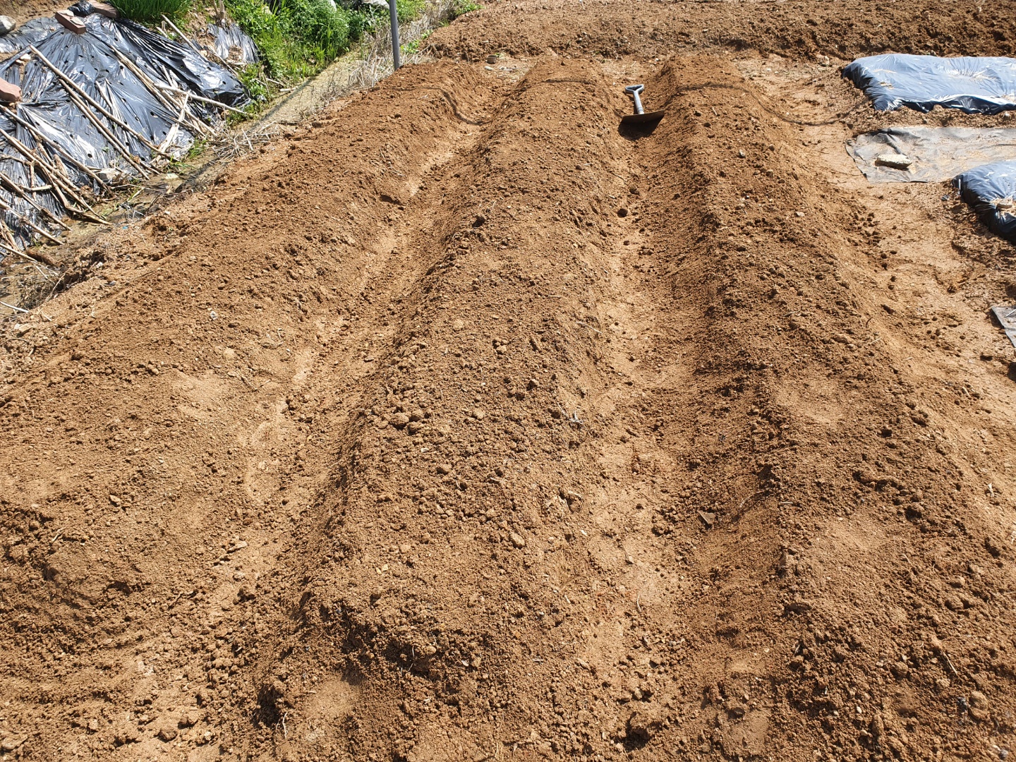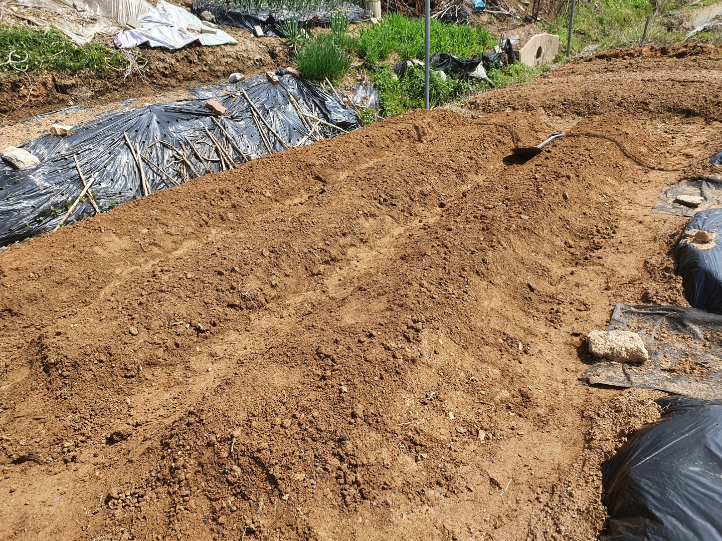 이것 또한 삽 하나로 끝낼 일... 이제 거진 마무리되었네요. 3개의 이랑으로 만들어 놓았어요. 다음에는 고구마 밭에만 멀칭과 잡초 매트를 설치하면 완성이겠습니다.
