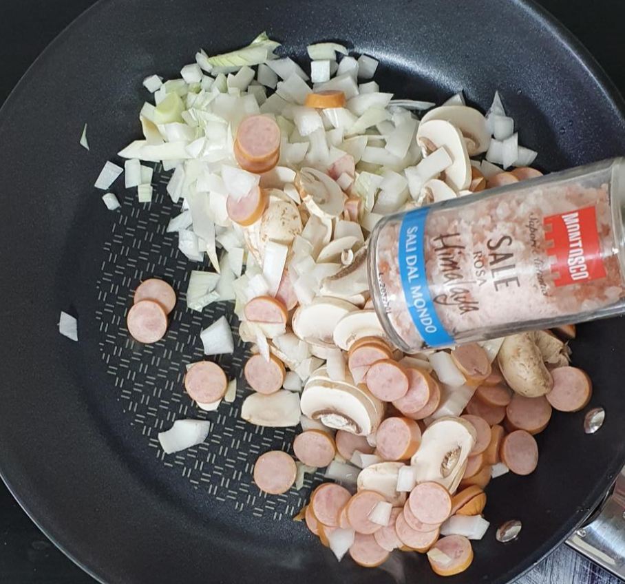 야채와 소시지를 볶아주시면서 소금 및 후추 간을 진행해 주세요.