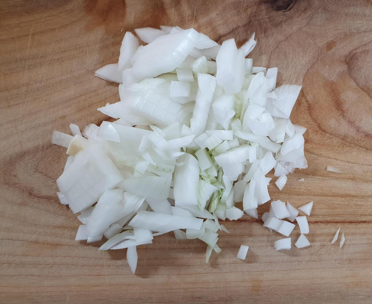 우선 양파를 준비해 주시고, 1개 정도 활용하여 잘게 다지듯 썰어서 준비해 주세요. 잘게 다져주어야 나중에 식빵 위에 자리를 잘 잡고 안착할 수 있어요.