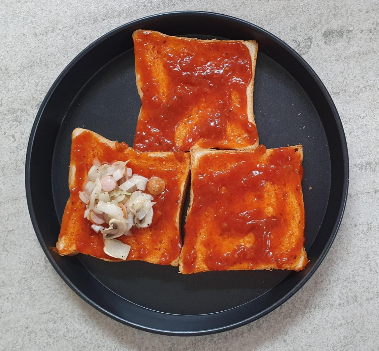 식빵 위에 고르게 펴 발라 주시면 끝이 납니다~ 맛있게 만들어야지 하는 욕심에 토마토소스를 많이 올리면 맛이 너무 강해질 수 있기 때문에 약간은 추천드리지 않아요. 뭐든지 적당히... ^^
