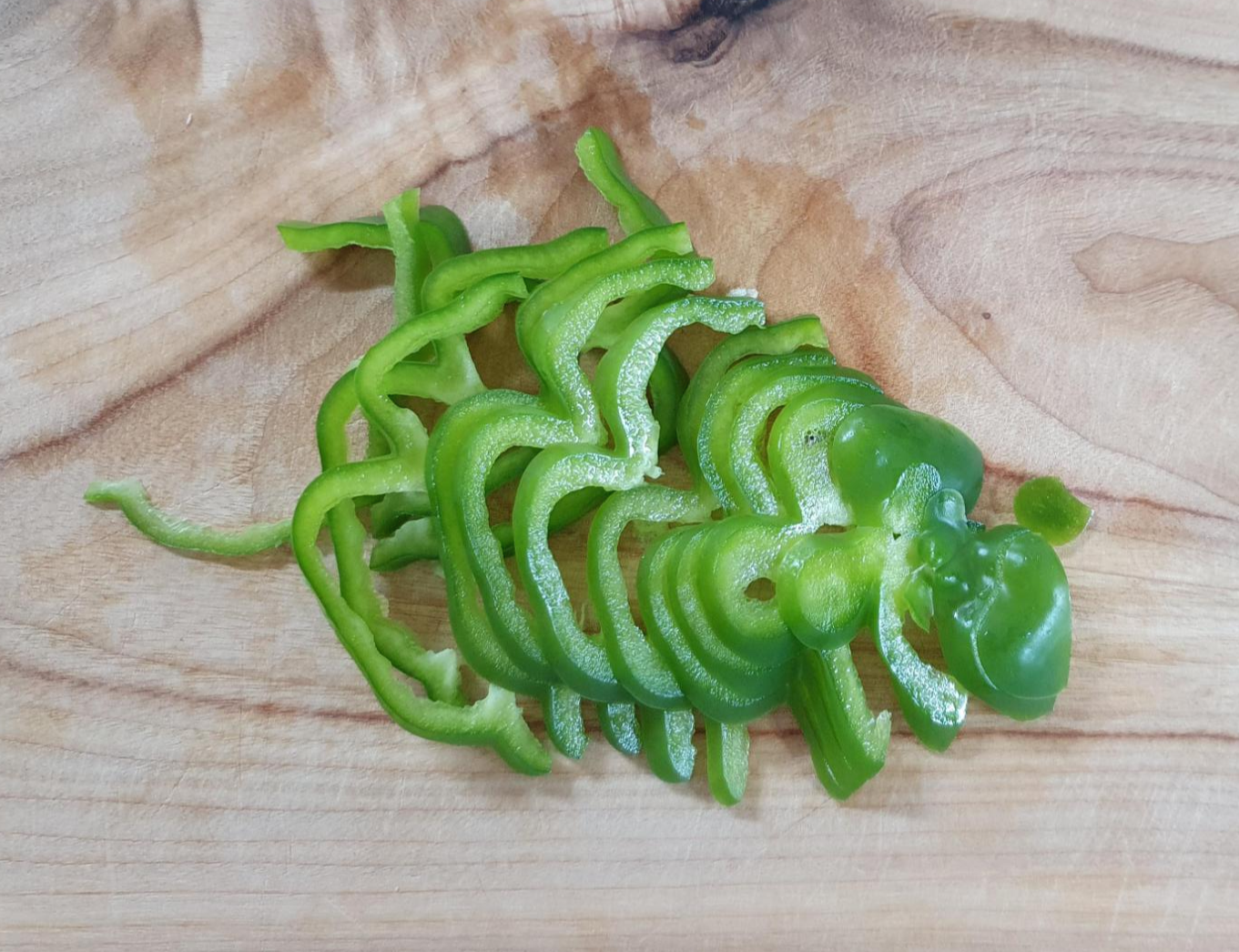 다음으로는 피방을 채 썰어 주시면 좋겠습니다. 저는 반 개 정도 사용하여 피자빵 3개 정도를 만들 생각이에요.