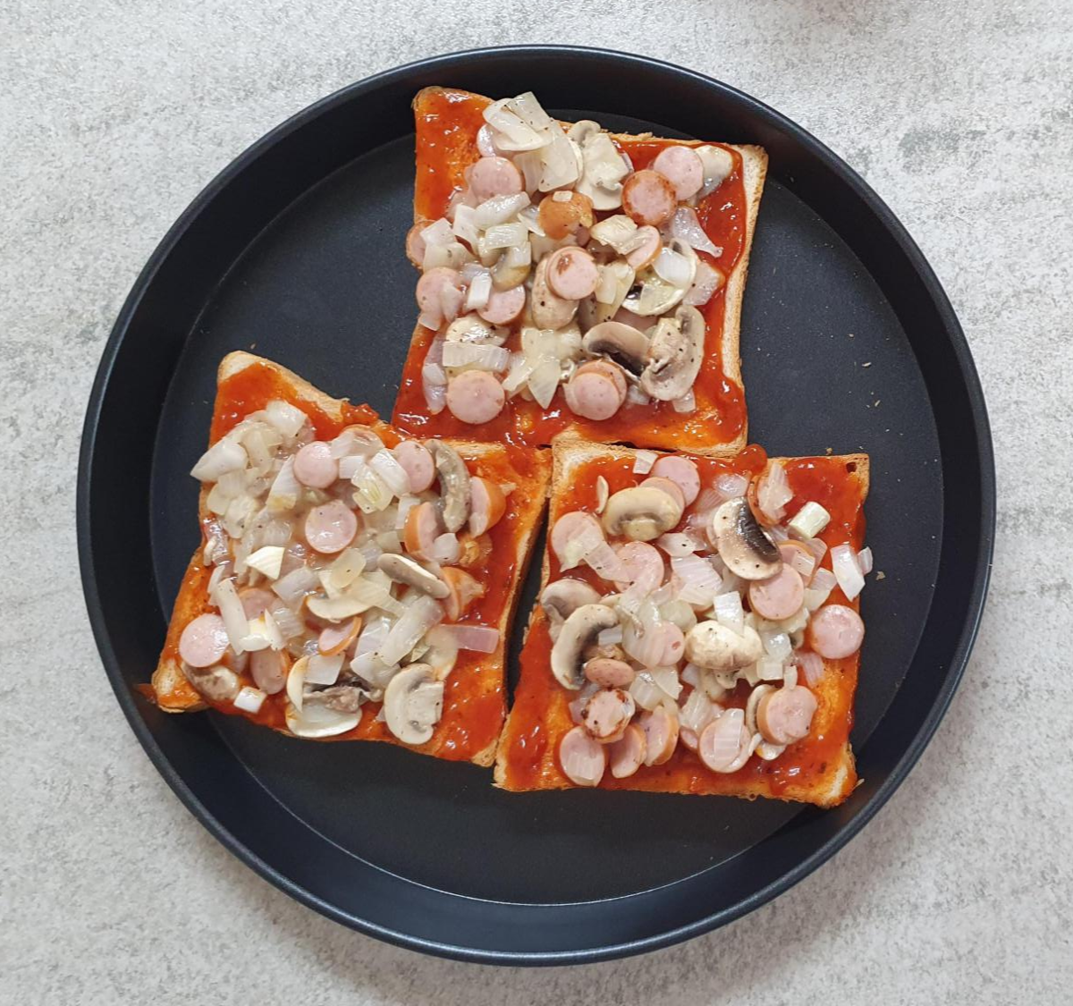 볶아 주었던 버터향을 입힌 야채 및 소시지를 토마토소스를 바른 식빵 위에 올려놓아 줍니다.