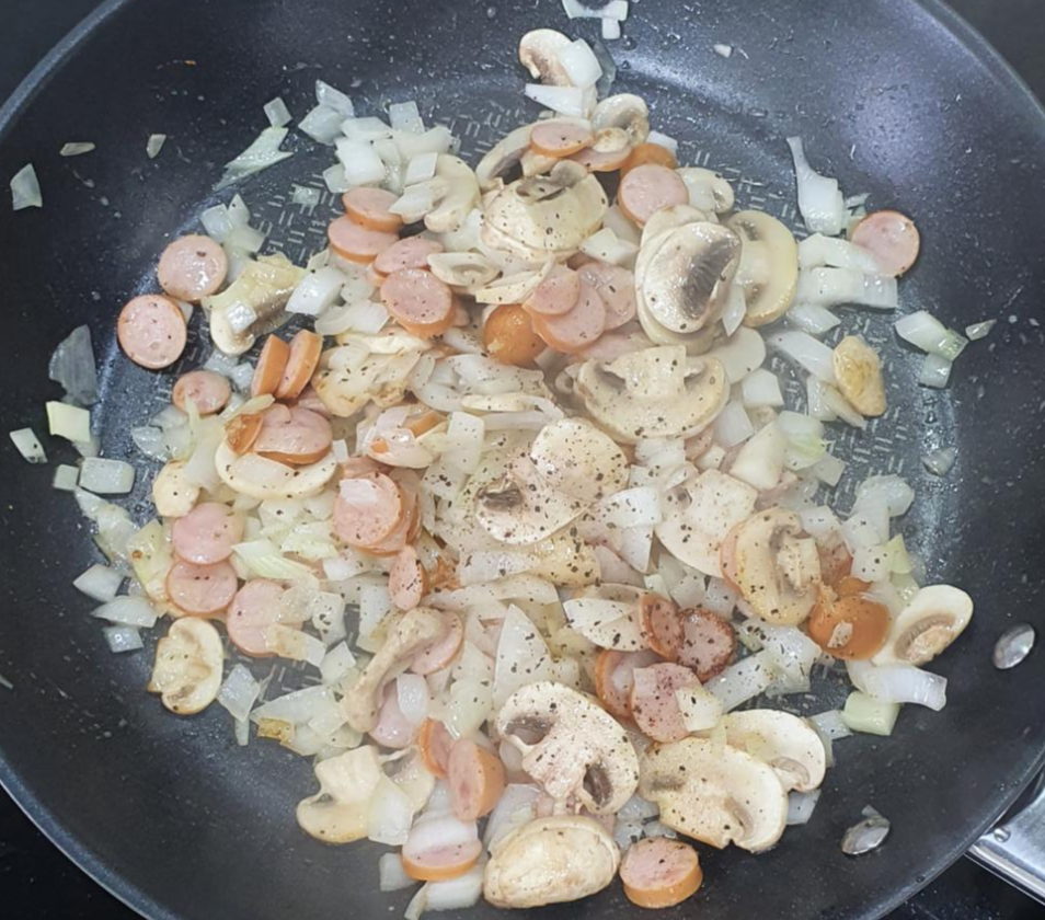 야채와 소시지를 볶아주시면서 소금 및 후추 간을 진행해 주세요.