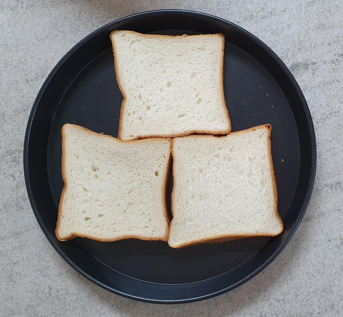 전용 오븐 트레이를 활용하기 위해서 트레이 위에 식빵을 바로 올려 주었습니다. 저희 가족은 3명, 3개를 만들 공간이 겨우 딱 돼서 다행입니다.