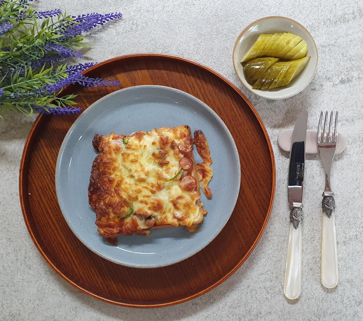 완성된 피자 식빵 하나를 플레이팅 하여 꾸며 보았네요. 정말 너무 먹음직스럽게 잘 익었습니다.