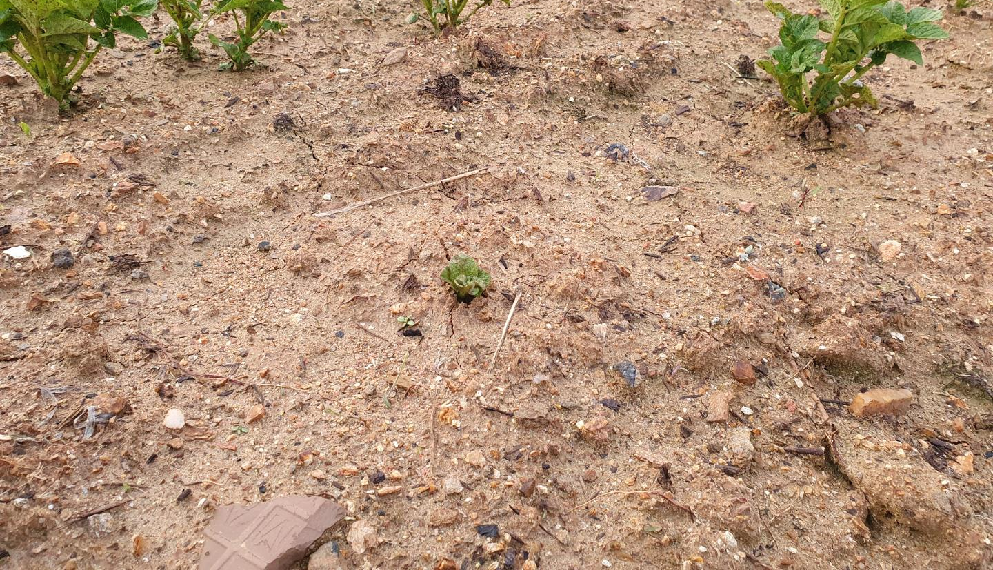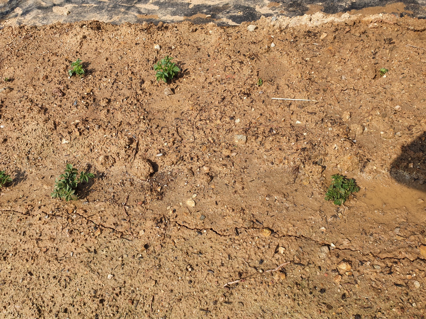 4월 3주 차에 두둑을 보시면 흙들이 뭉쳐 딱딱하게 굳어 갈라지는 모습을 보실 수 있어요. 그위에 비가 오면 더욱 굳어지게 되는 것이지요.