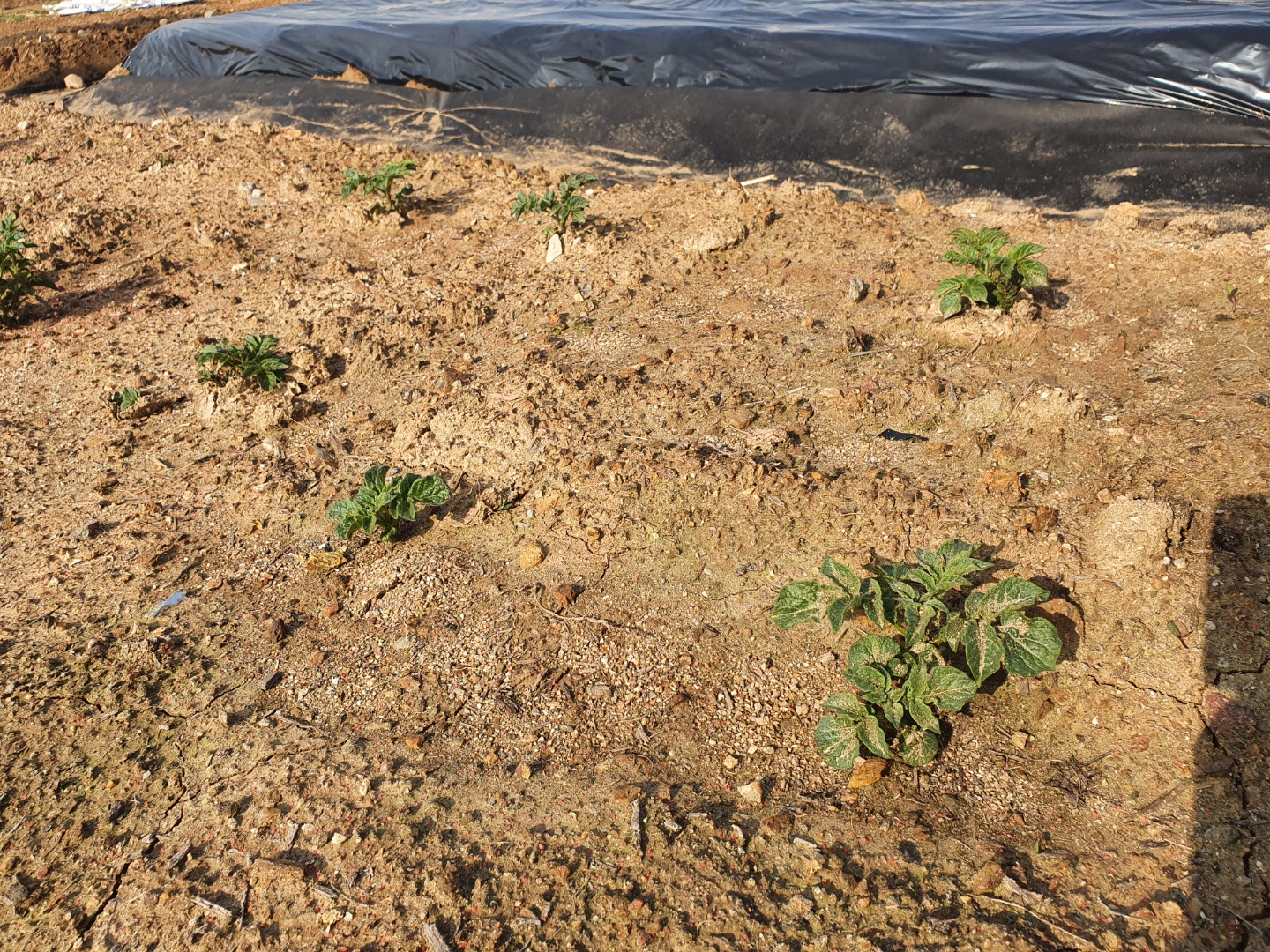 제법 올라온 새싹들도 눈에 보이지만, 아직 싹 땅위에 올라오기 시작하는 감자들도 있어요.