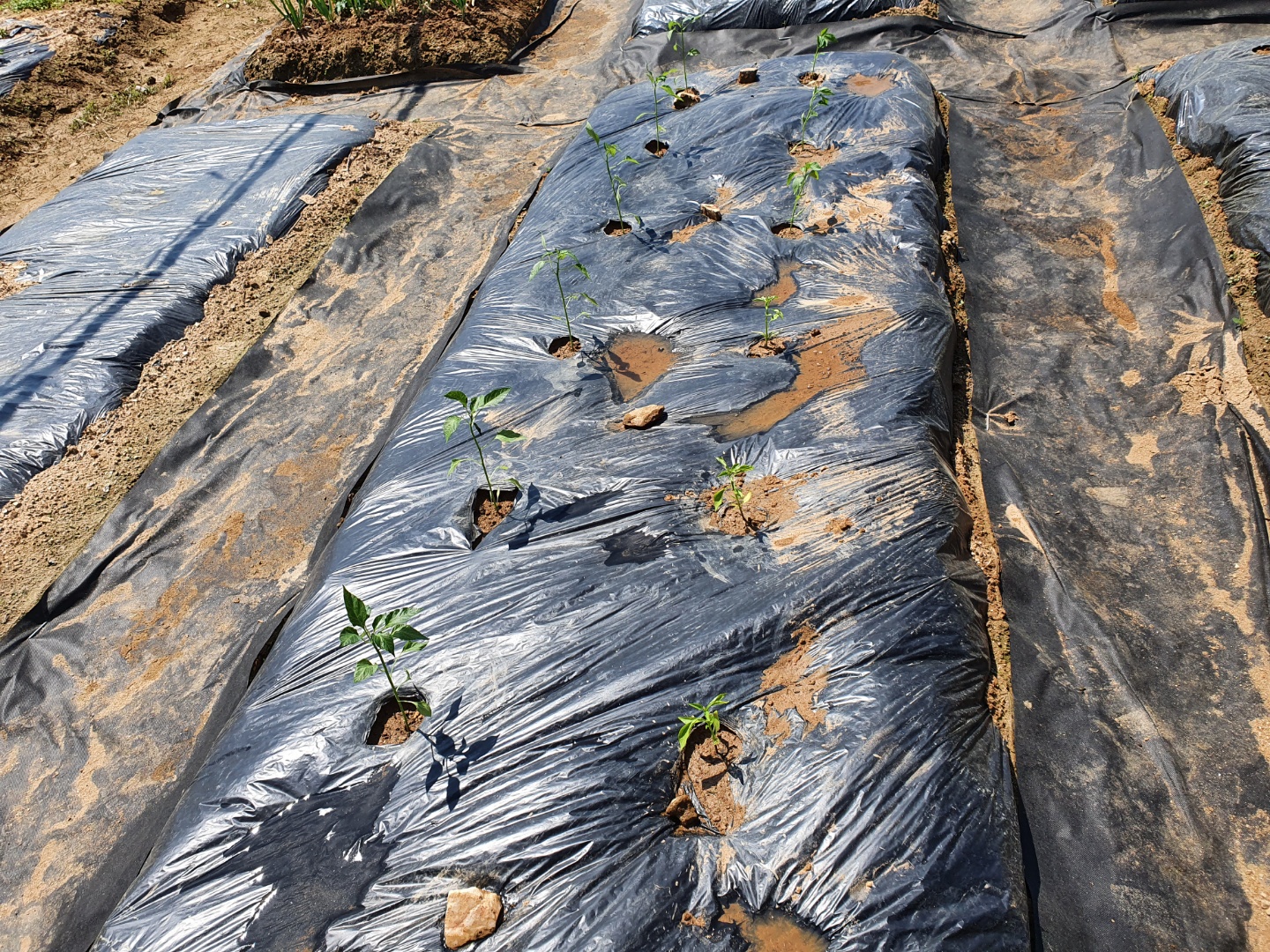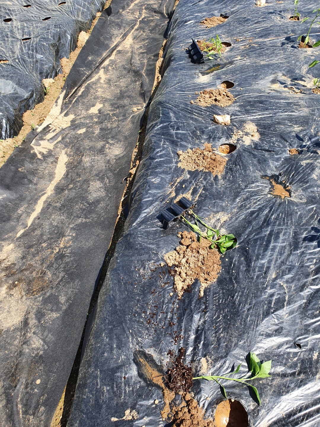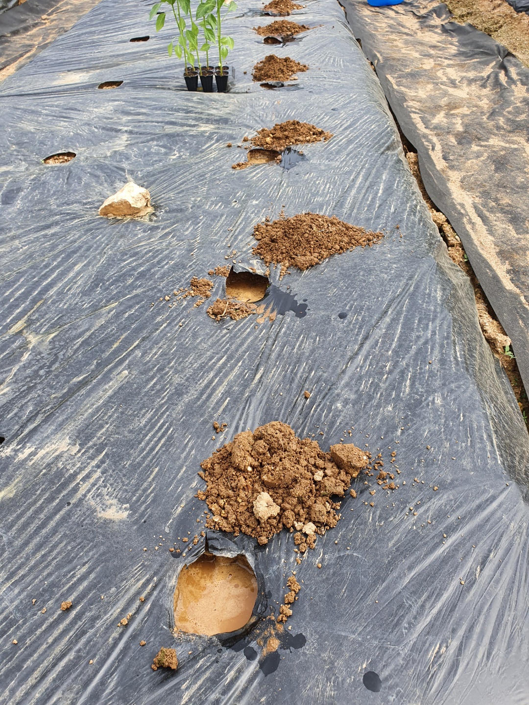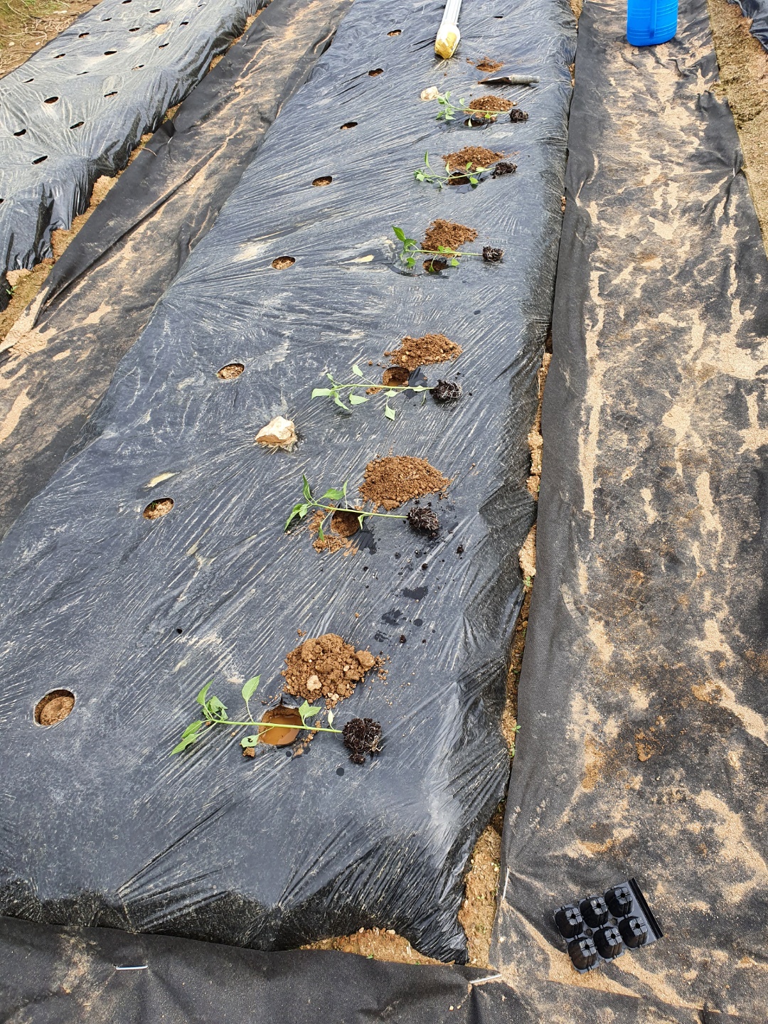 우선 멀칭이 완성된 두둑이 있어야 할 것이고, 완성된 두둑에 구멍을 내면서 고추가 자랄 수 있는 자리를 확보해 주어야 합니다.