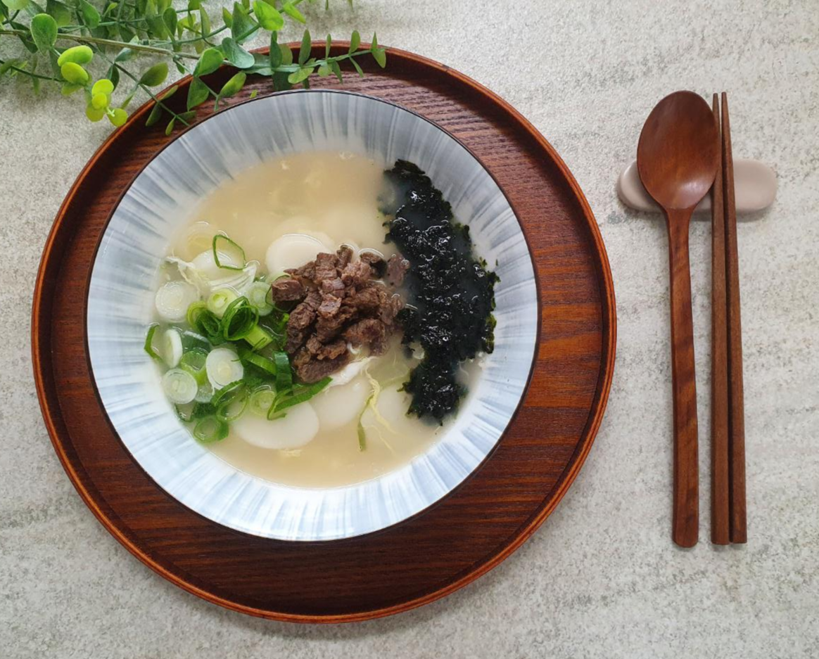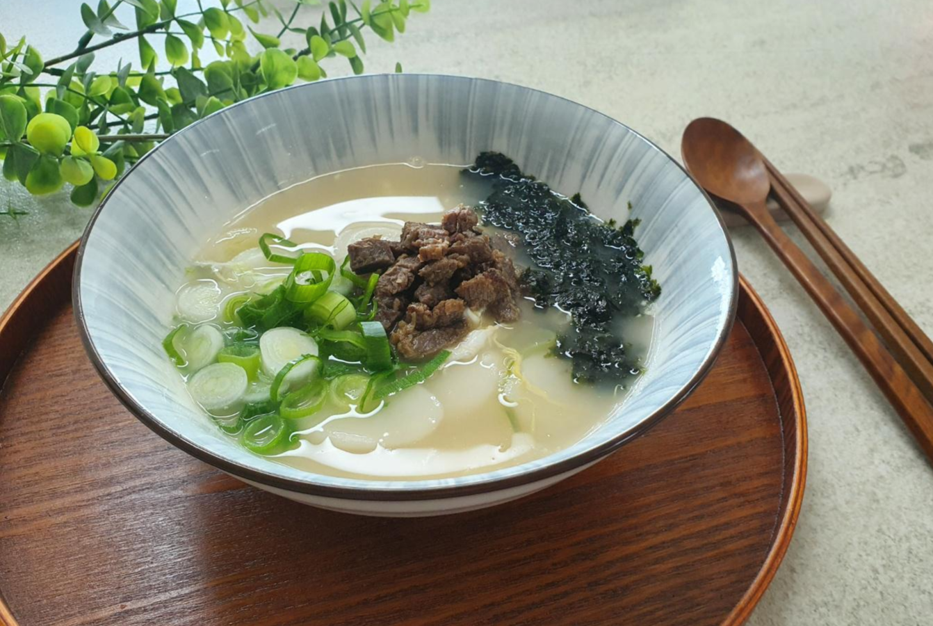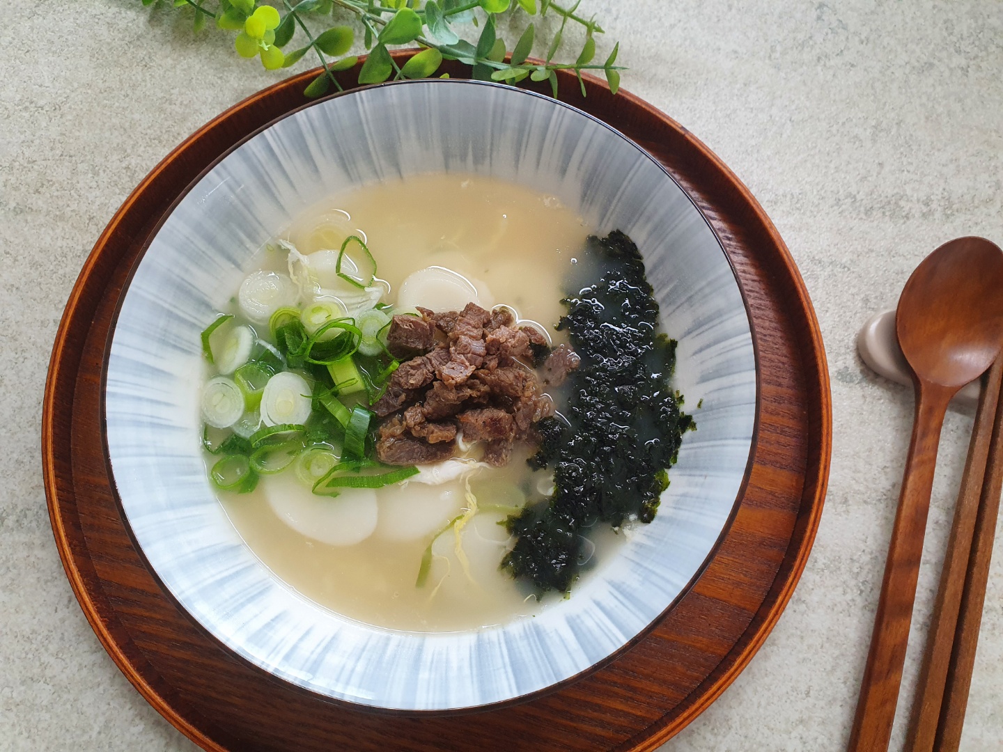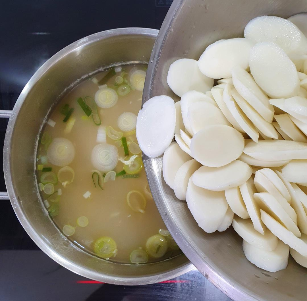떡은 상온에서 물에 담가 떡을 미리 불려 넣어 주시면 육수를 완성하고 얼마 있지 않아 바로 떡국을 완성할 수 있어요.