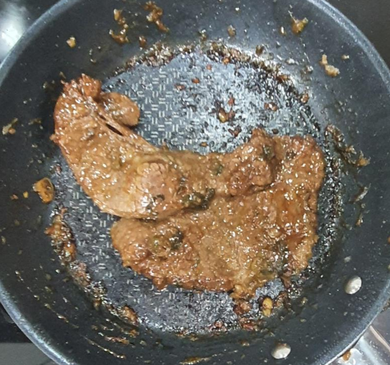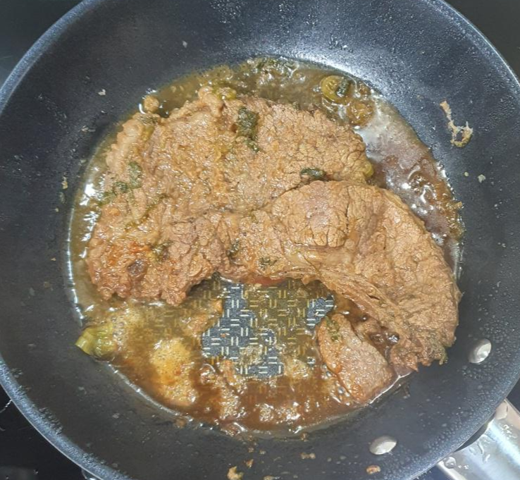 처음에 익힐 때에는 중간 불로 뚜껑을 덮어주시면서 익히게 해 주세요. 양념 및 수분이 생기게 되는데 고기가 익을 때까지 유지해 주시고, 기다려 줍니다.