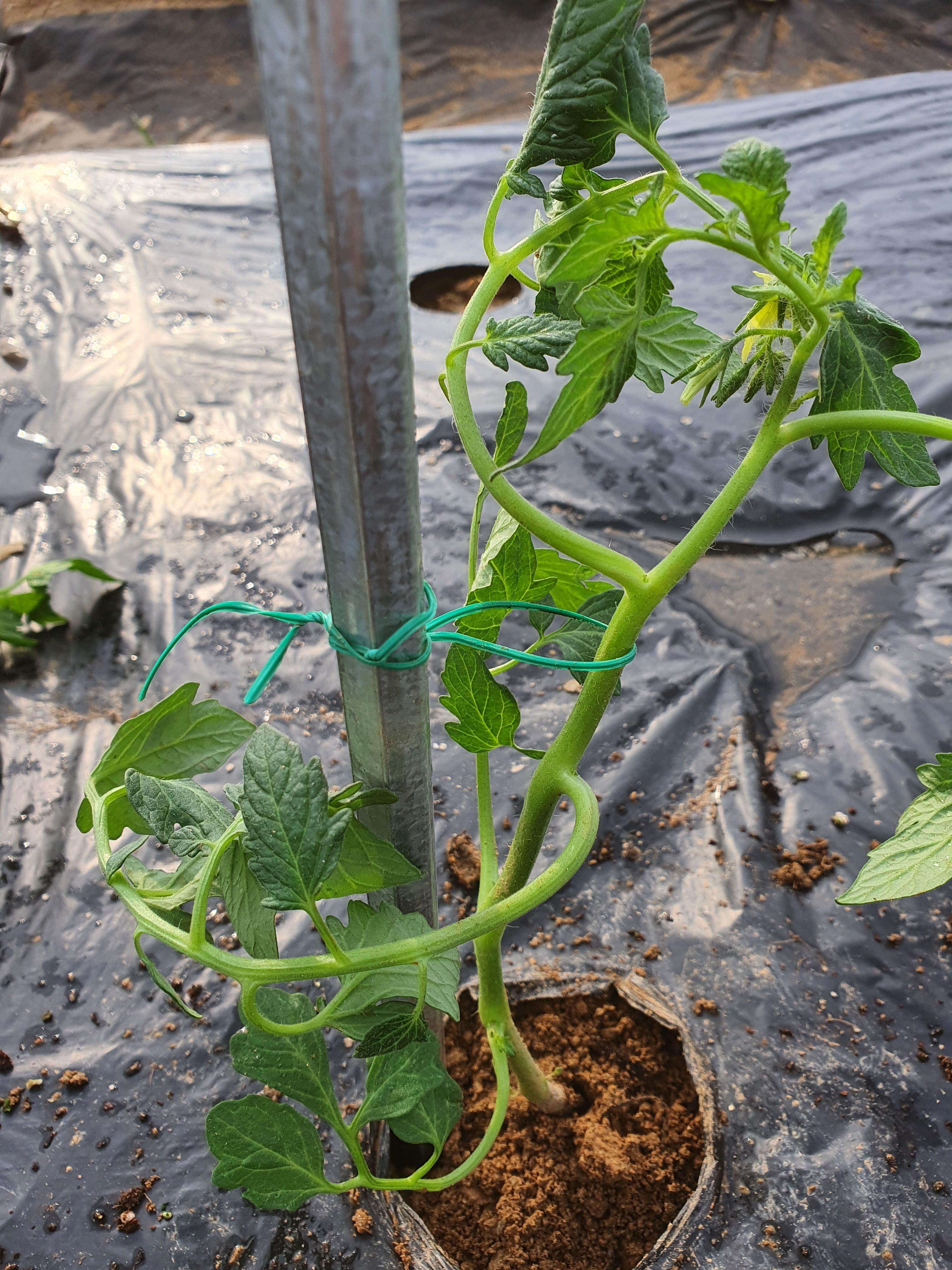 고개 숙인 토마토 옆에 든든하게 서있는 모습입니다~! 이렇게 지주대를 토마토 옆쪽에 설치해 주신다면 마지막 작업이 남아있어요.