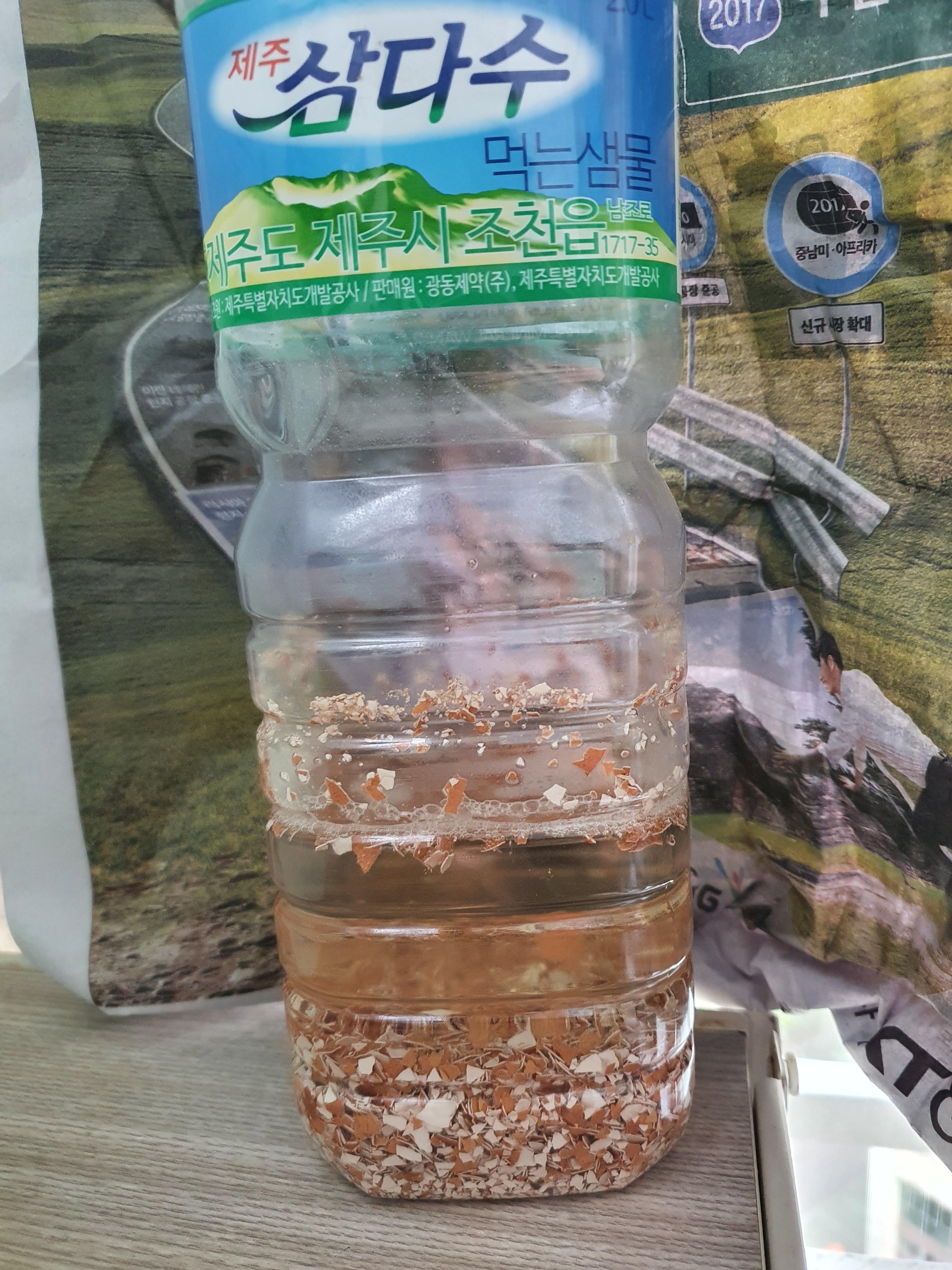 2L 페트병 넉넉한 사이즈로 진행해 보도록 할께요. 잘게 부셔놓은 계란껍질 먼저 페트병안으로 담아 주세요.