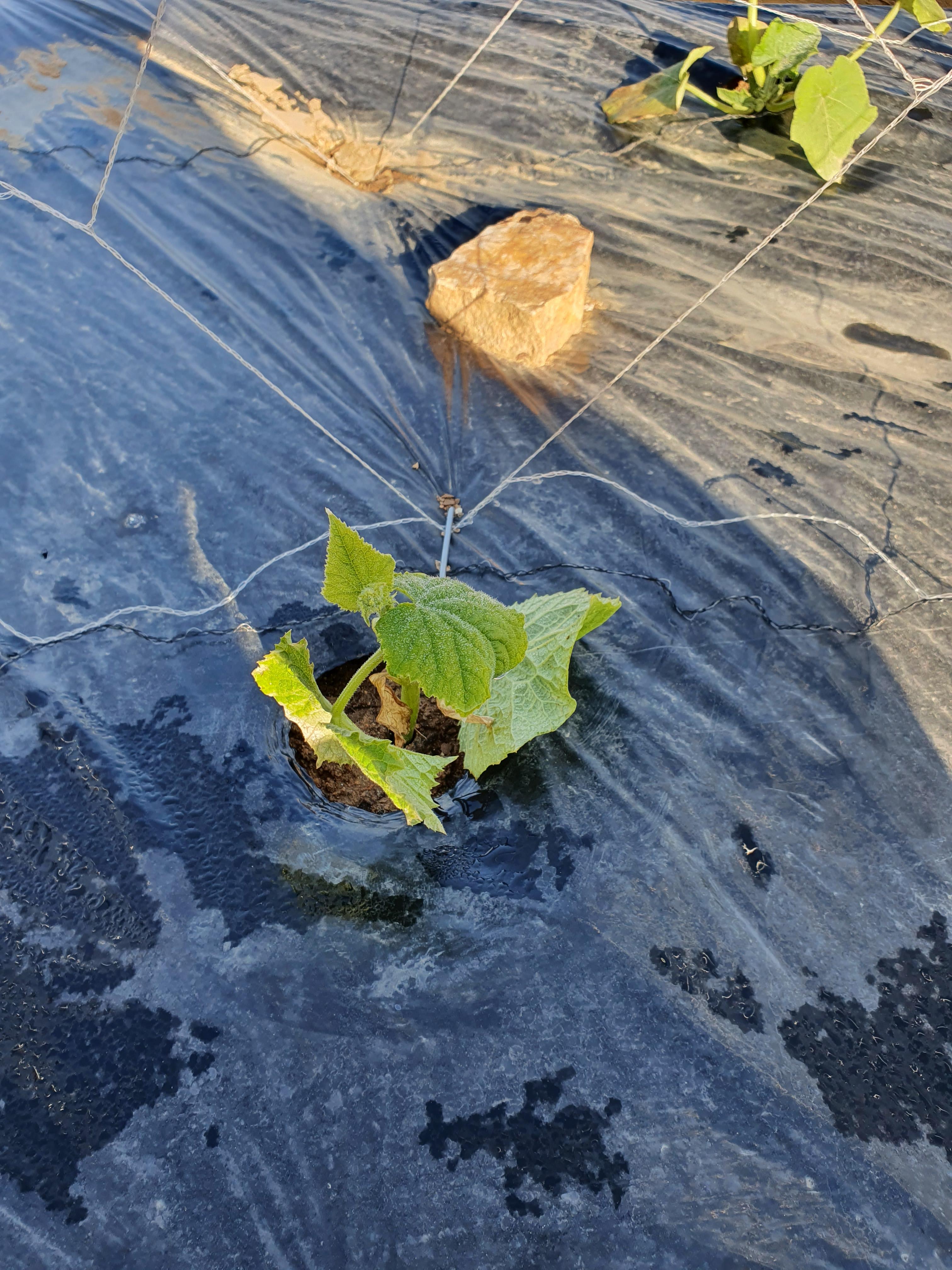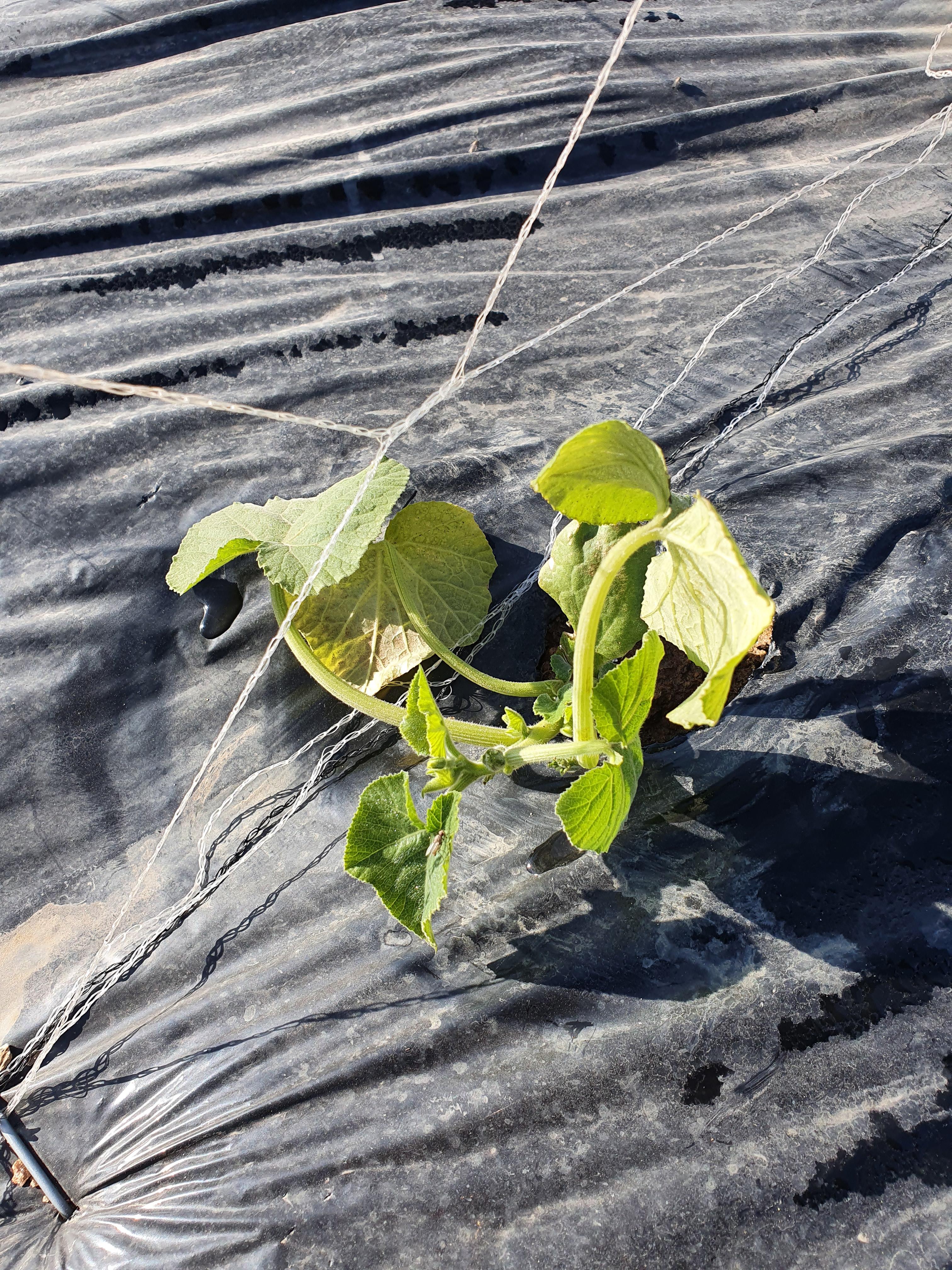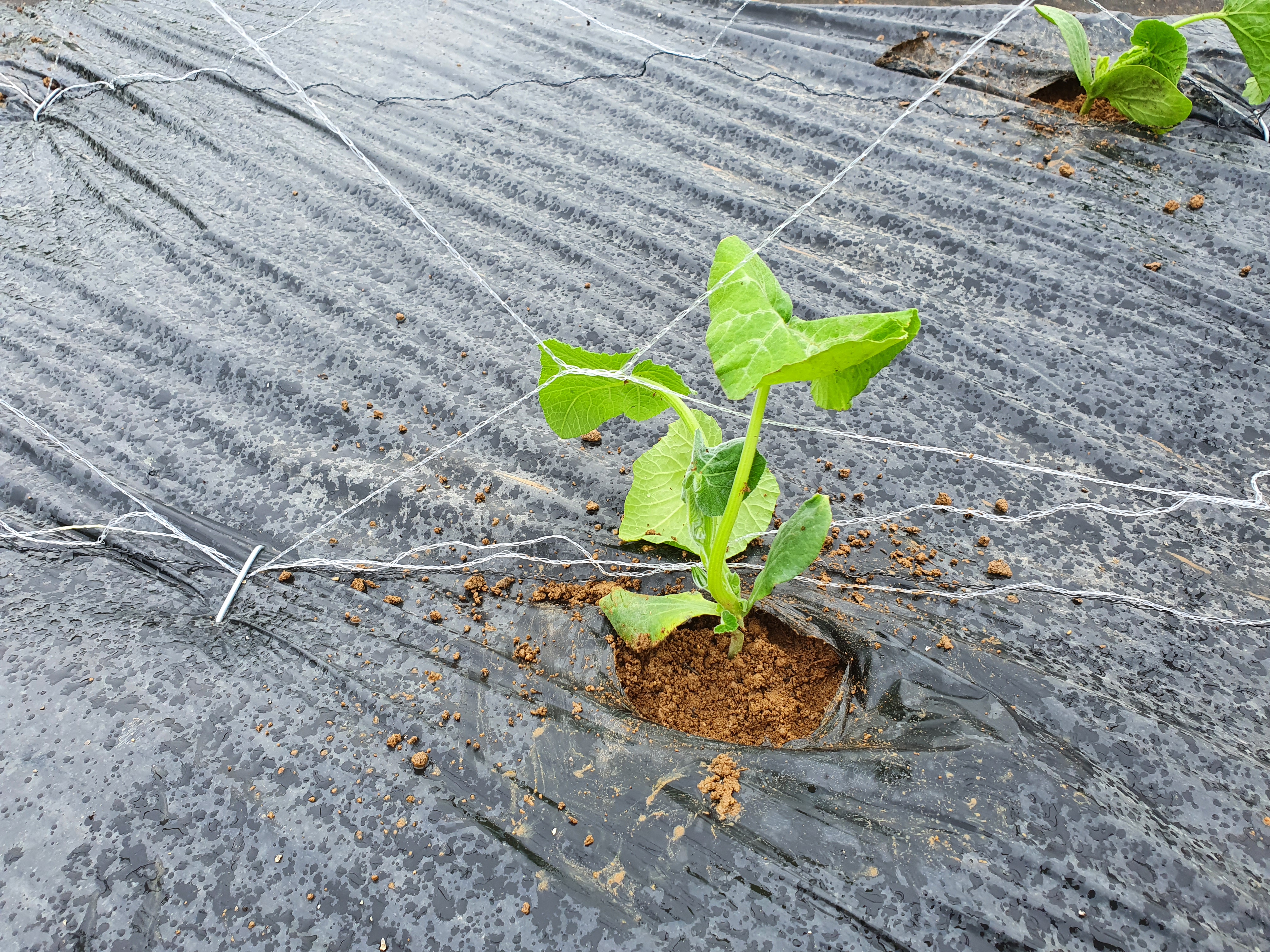 풋호박 모종도 아주 건강하게 자라줄 것 같아요. 일단 모종의 위치를 잡으실 때는 지주대와 오이망을 설치한 후, 오이망에 호박이 잘 걸쳐서 자라날 수 있도록 위치하여 주시면 되겠습니다.