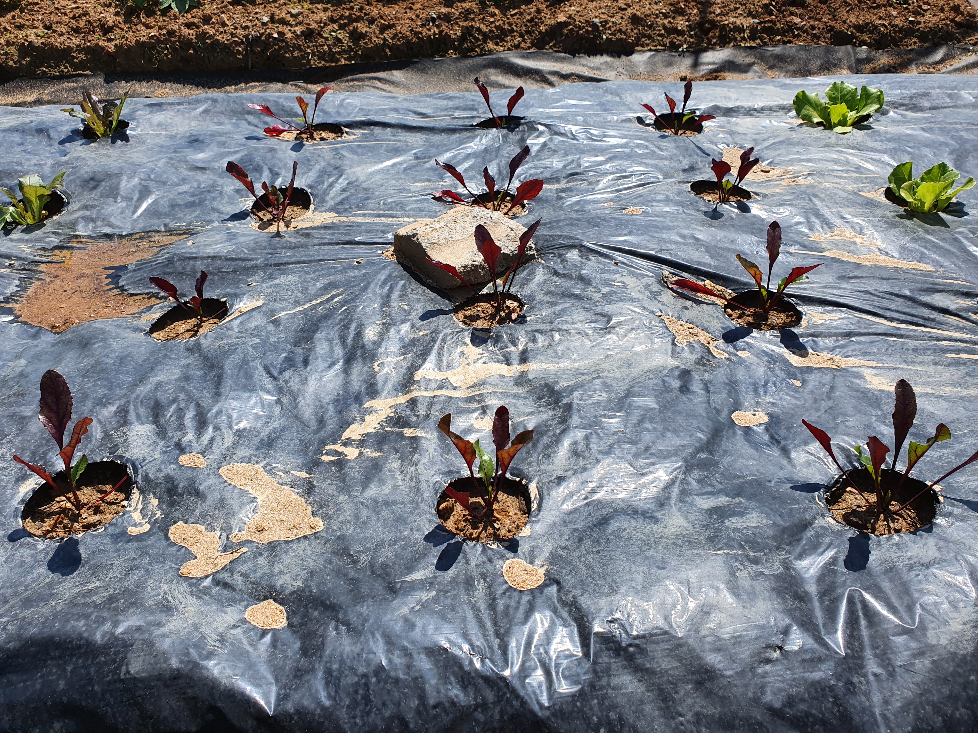 바람에 멀칭비닐이 구멍 사이로 흔들려 성장에 피해를 끼칠 수 있을 것 같아 돌 하나를 올려놓았는데, 너무 큰 돌을 올려놓은 것은 아닌가 싶기도 하네요~^^