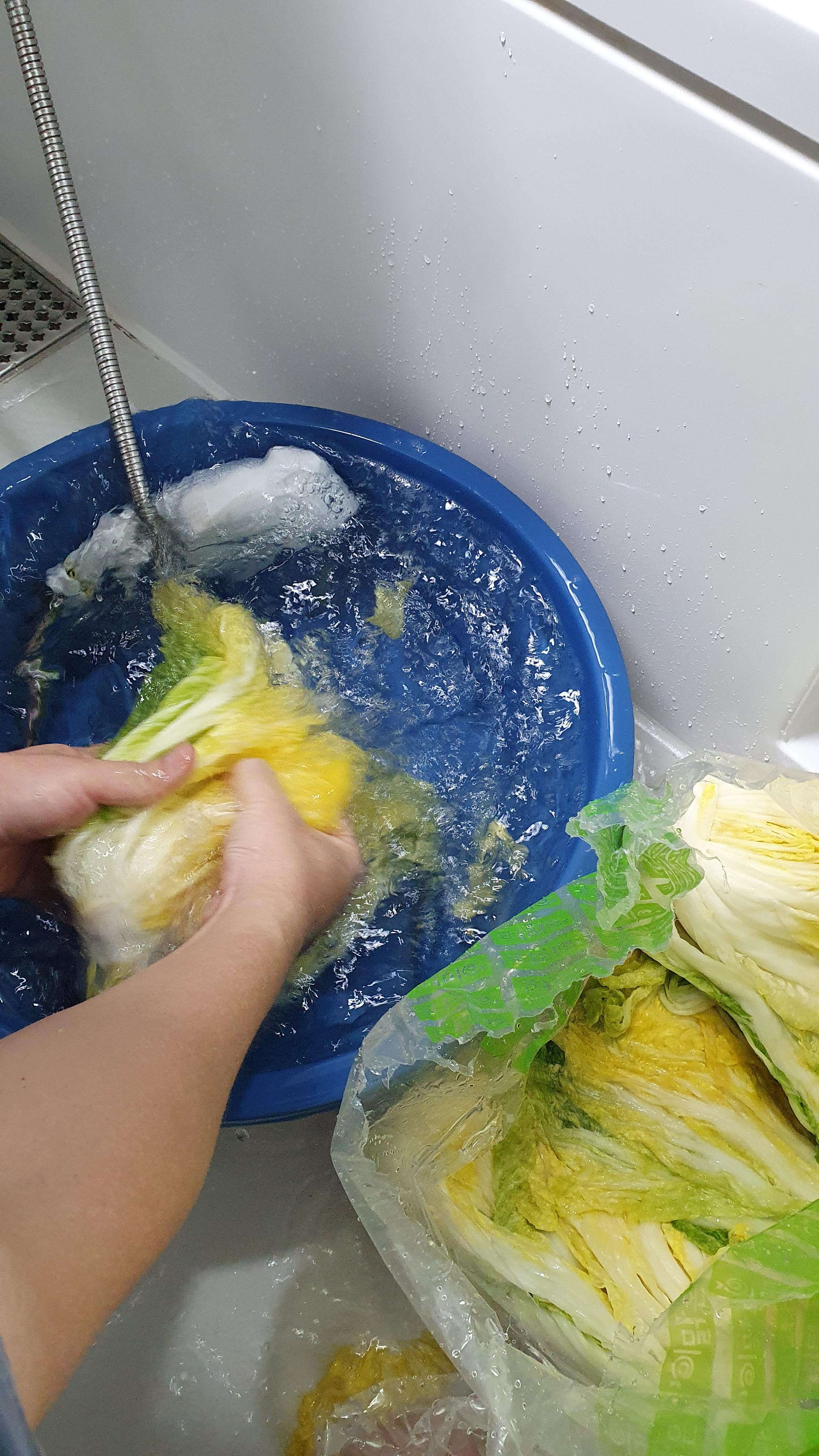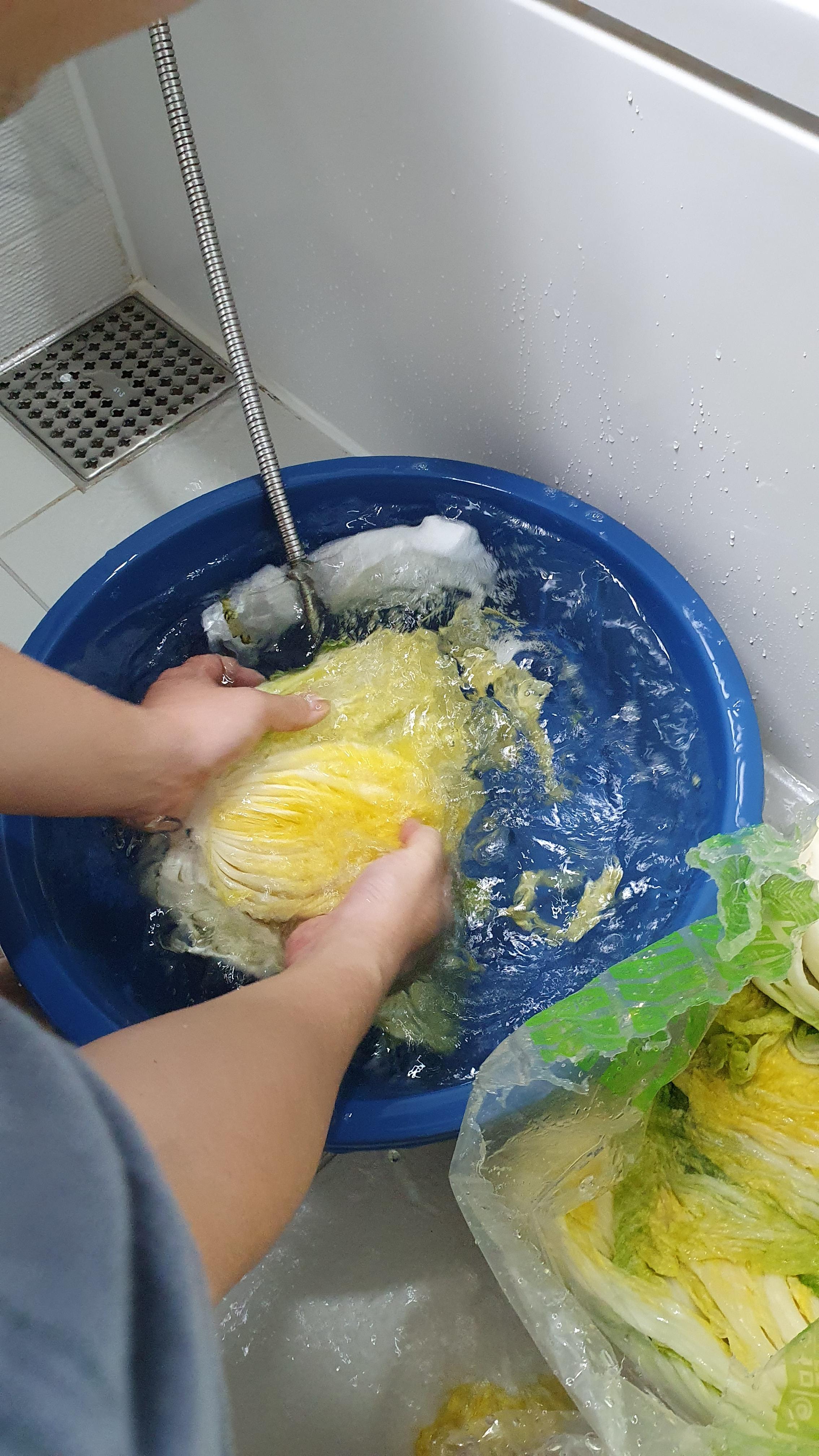 사이사이 이물질이 낀 것이 없는지 흔들흔들하면서 닦아주었습니다. 잘 씻어서 왔는지, 이물질은 씻은 물을 보니 없어 보였어요~ 화원농협에서 절임배추 준비할 때 정말 청결로 준비해주시는구나 생각했지요^^