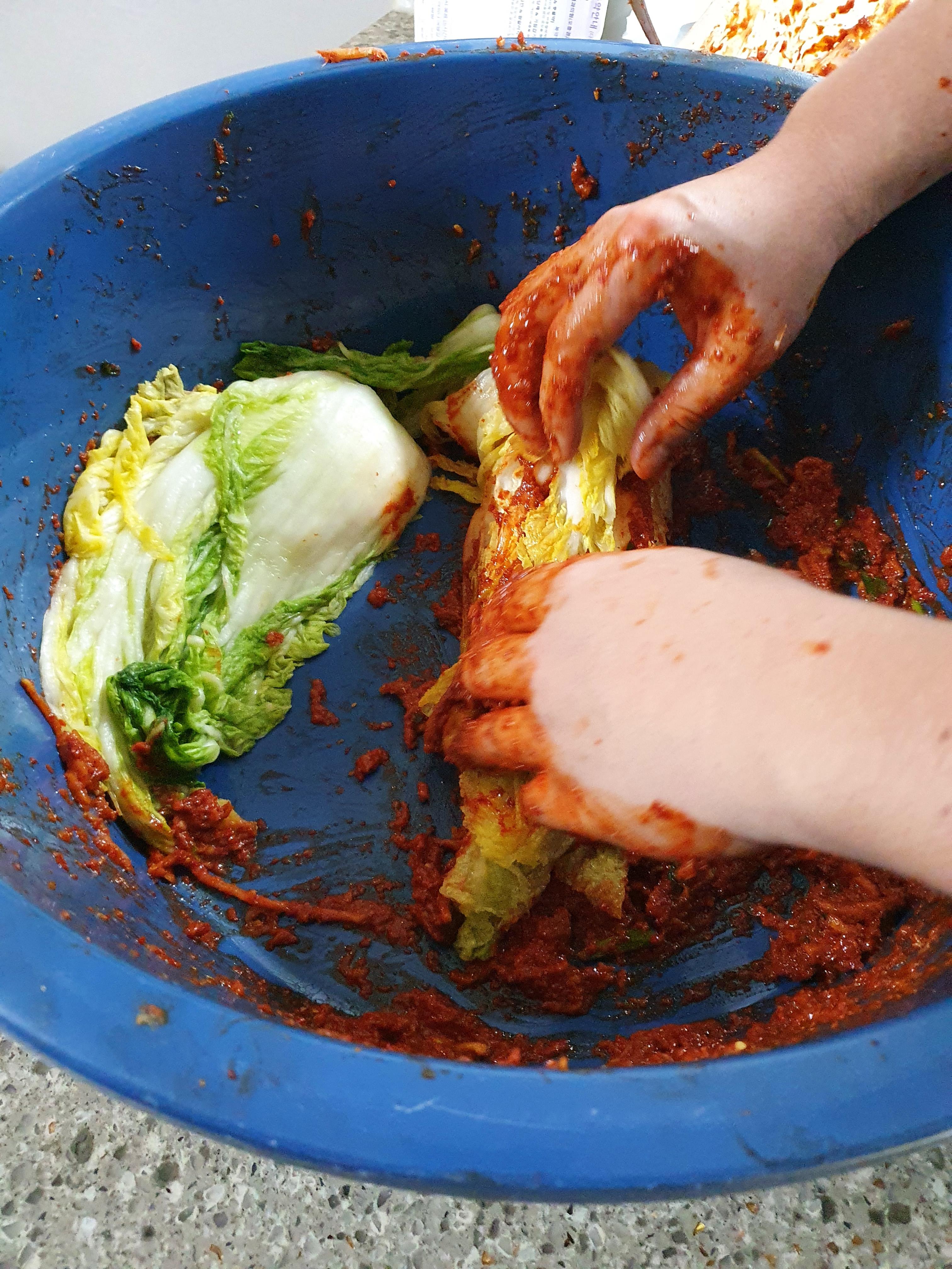생새우를 투입할 때는 새우에서 물이 생기기 때문에 간수 뺀 천일염을 조금 더 넣어주면서 간을 유지해 주어야 한다고 어머님 전화찬스로 물어본 후 , 소금 조금과 함께 투하했답니다. 양념장과 섞어 논 후에 드디어 2시간이 지나 김장 시작!