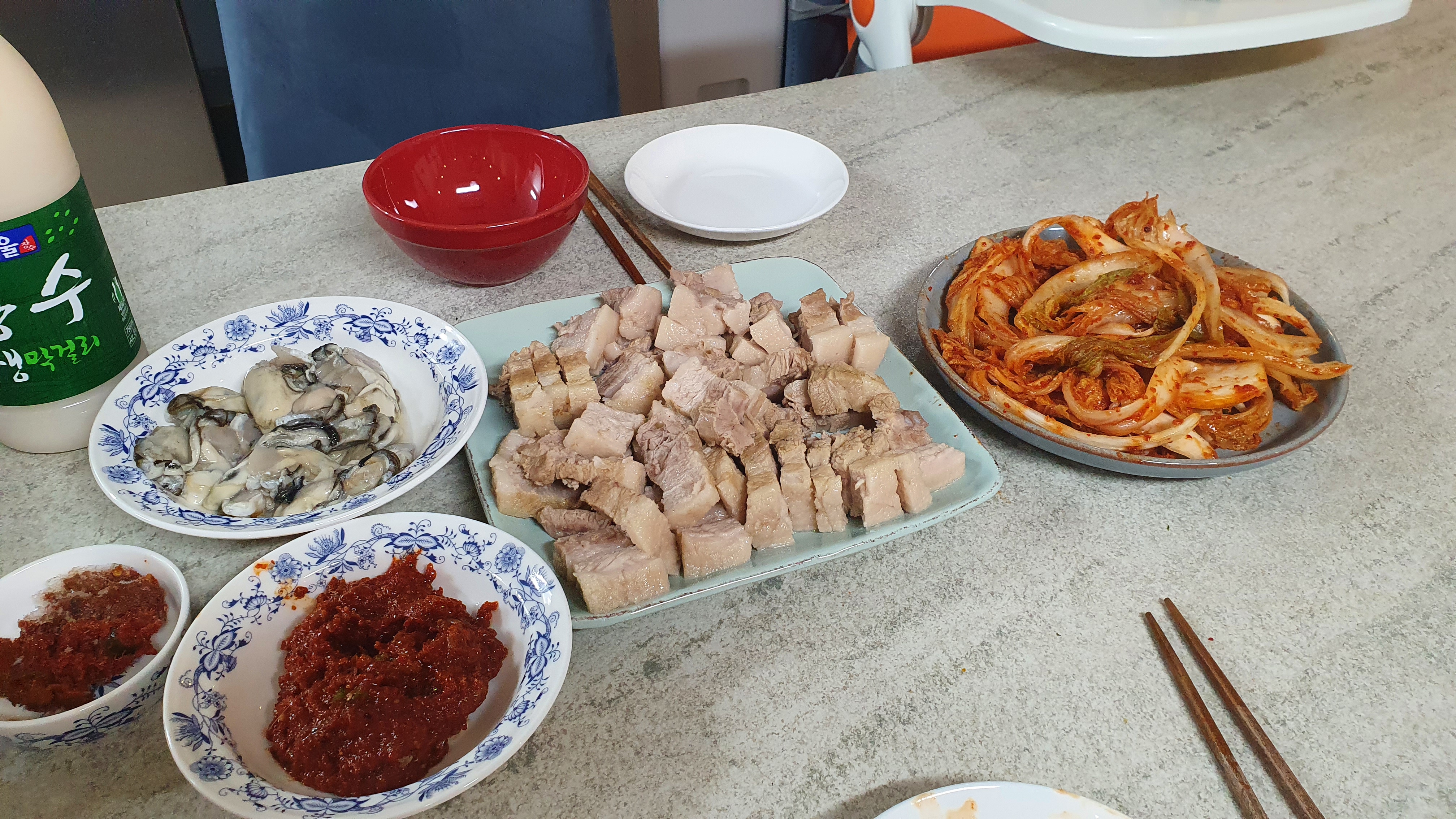 3시간 내 김장을 끝낸 것 같습니다. 너무 양이 생각보다 적어서 너무 손쉽게 끝나 그전에 했던 마음의 긴장감은.. 약간 허무할 정도로 날아가버리네요~ 그래도 수고했으니, 수육은 먹어야지~