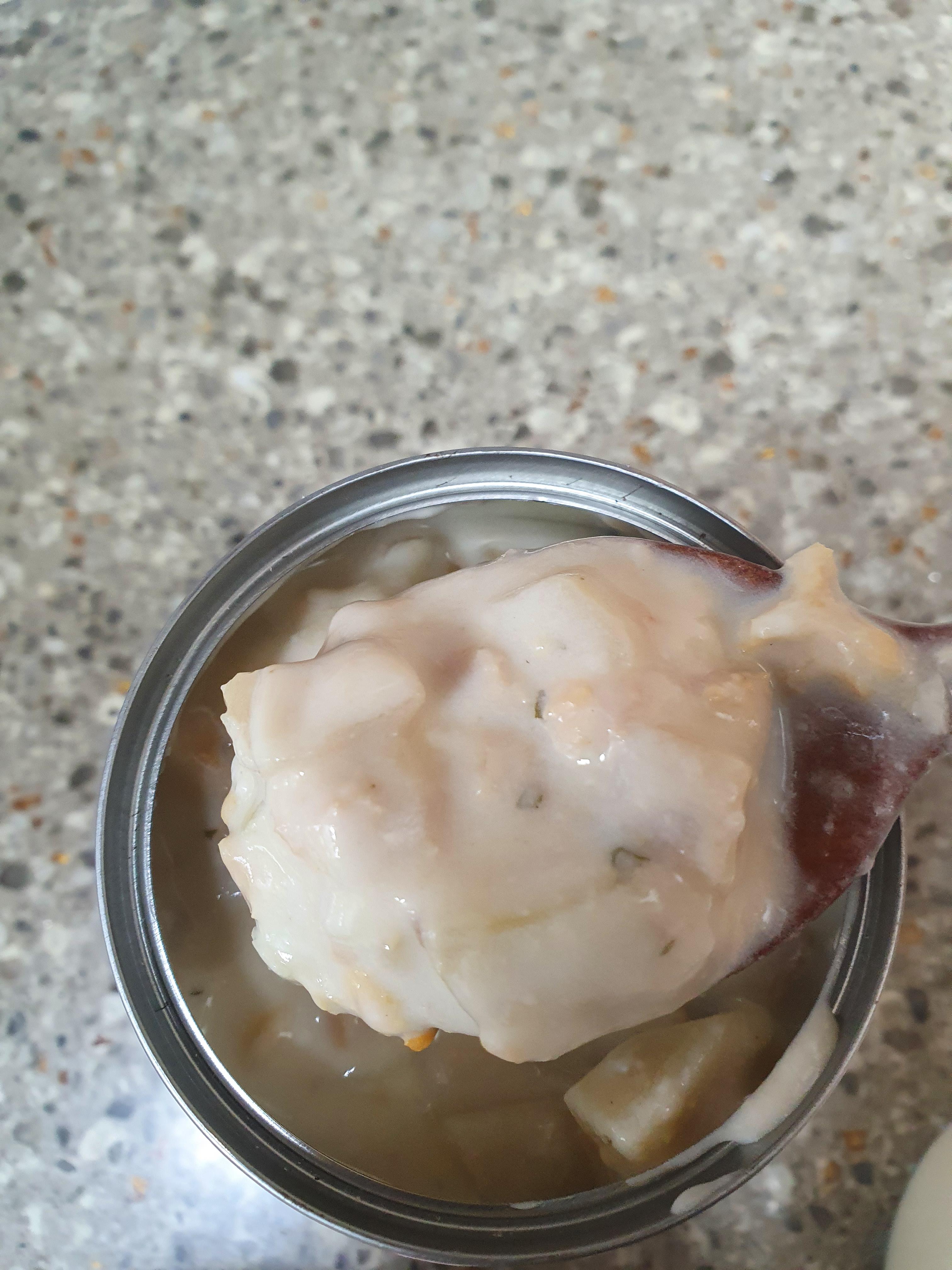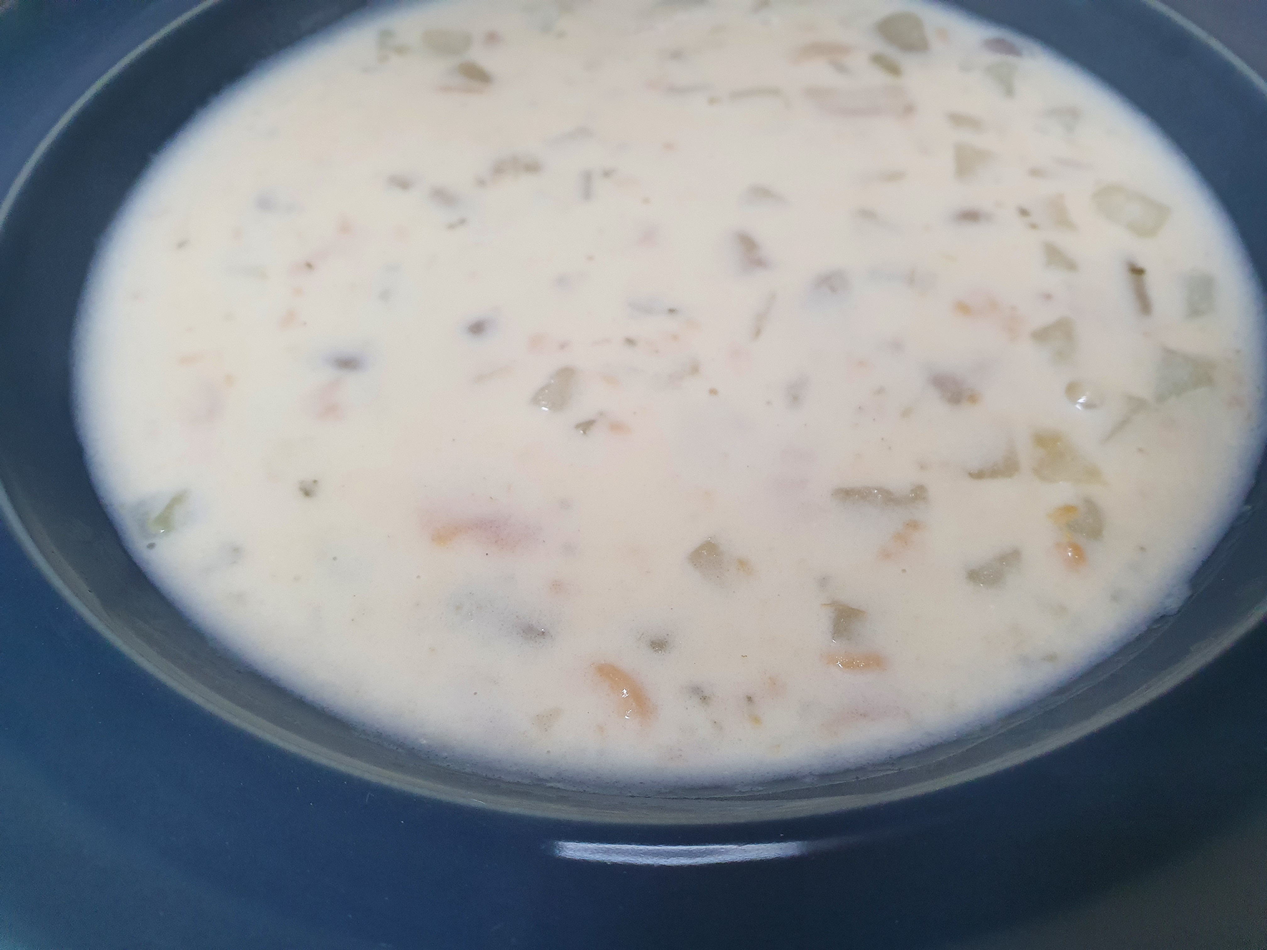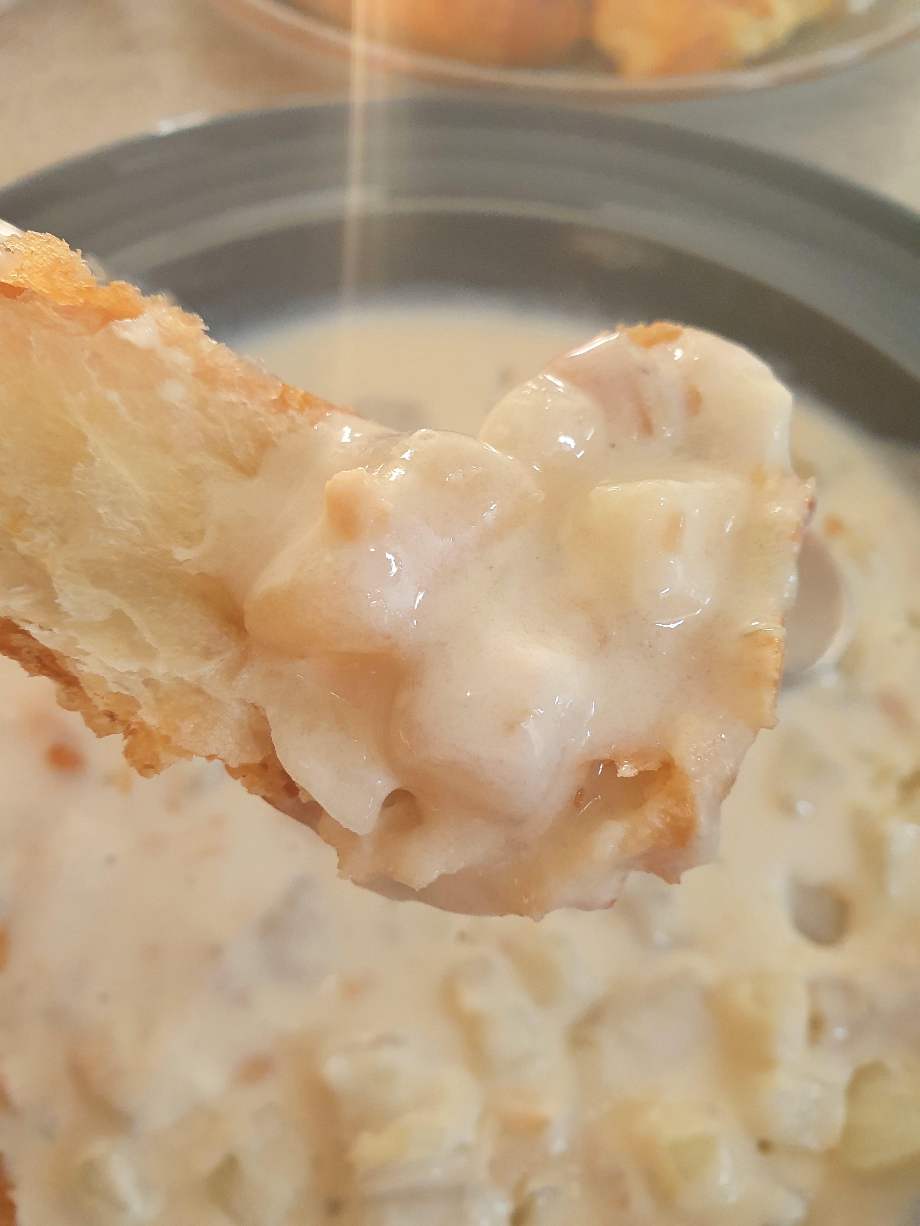 이렇게 캠벨 조개 수프를 완성하여 플레이팅 진행했어요~ 나름 괜찮은 비주얼이라 생각되는데.. 어떠신지 모르겠어요~? 추가로 넣은 감자들이 보이네요~^^