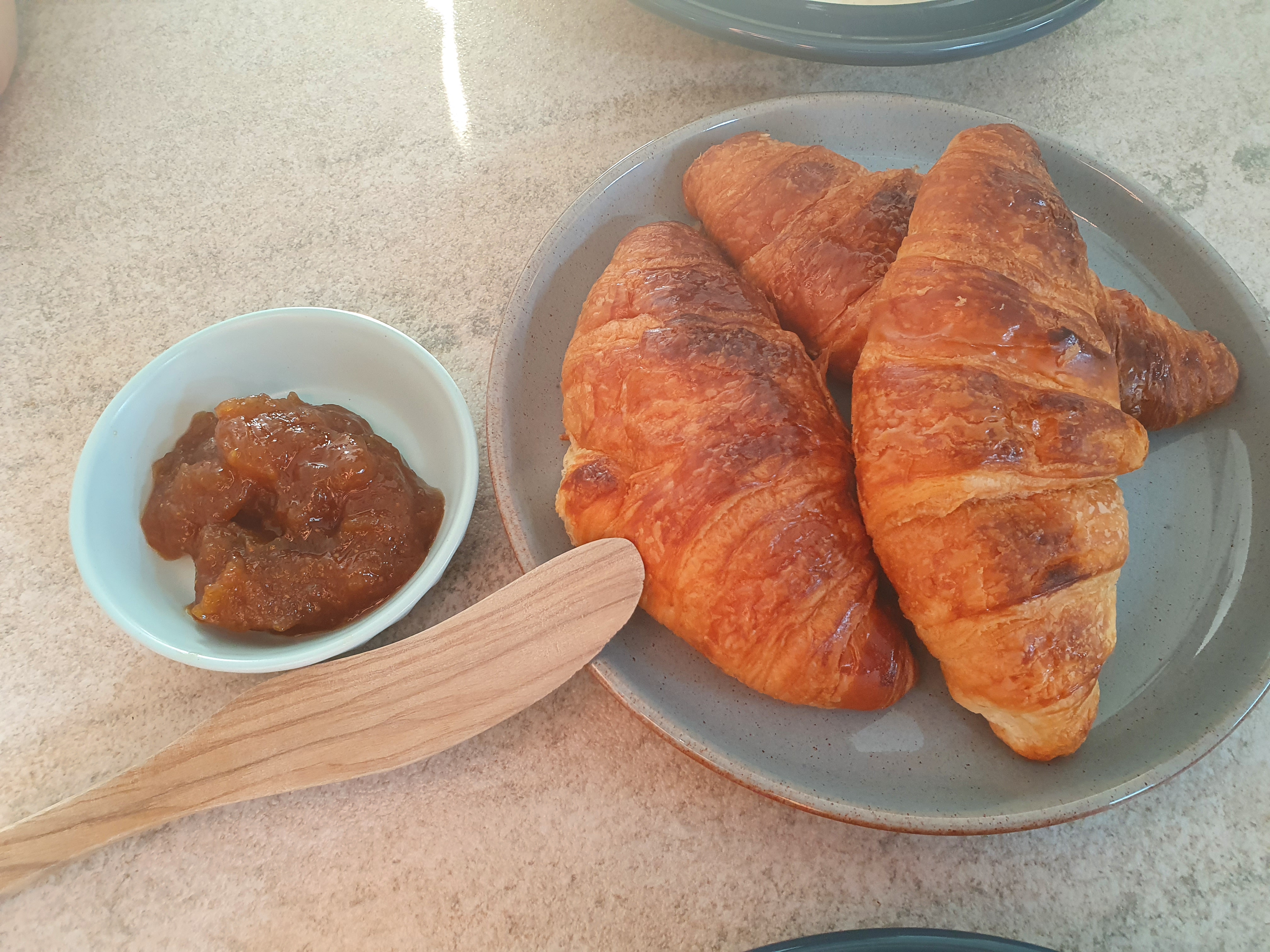 준비하는 동안에 에어프라이어에 빵을 살짝 데워 놓아주었습니다. 트레이더스에서 준비해 놓고 냉동 중이던 크루아상.