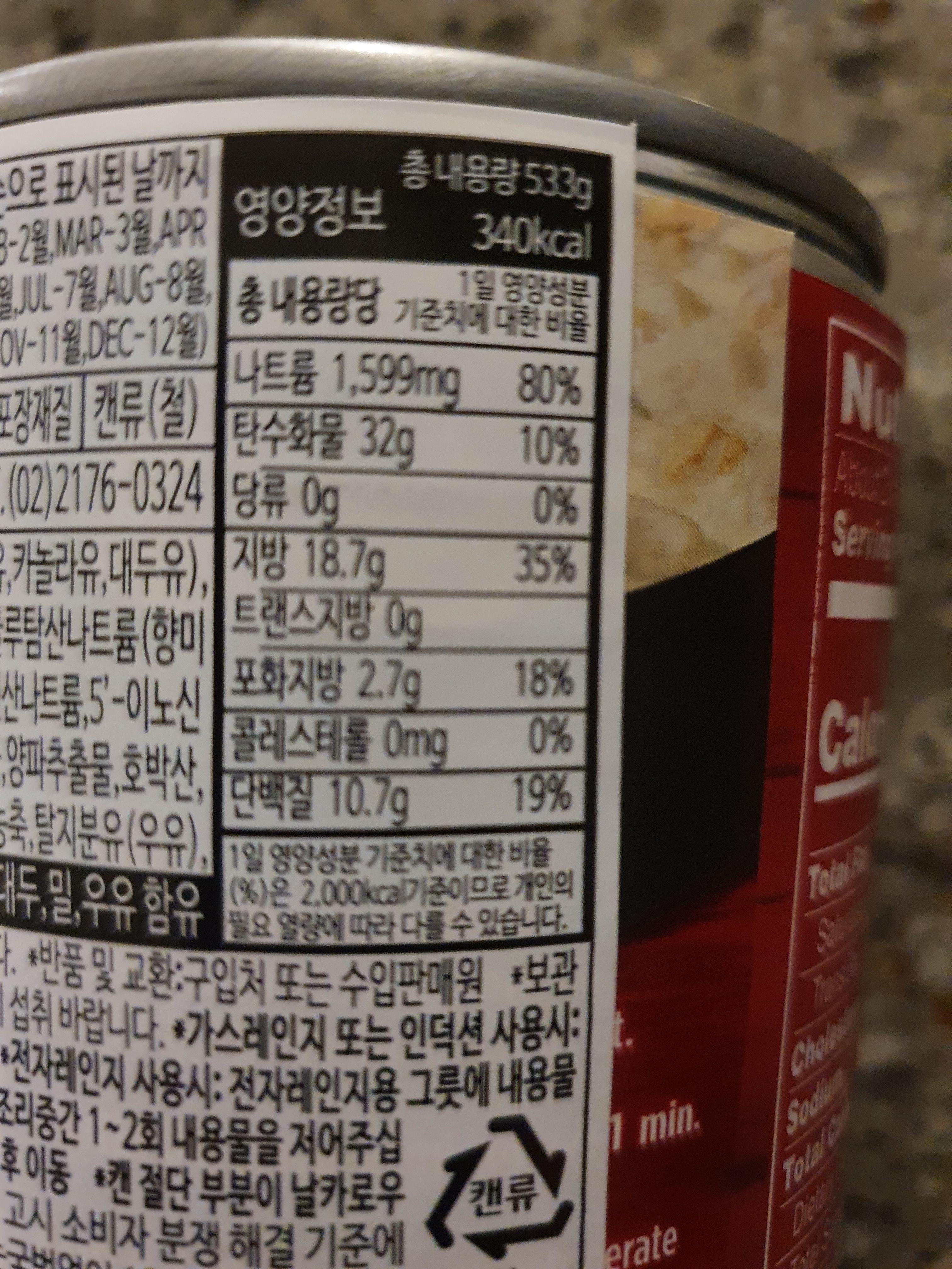 총 내용량은 533g으로 구성되어 있고, 칼로리는 340kcal로 기재되어있네요~ 저는 그다지 큰 영향이 없어서... (포기)