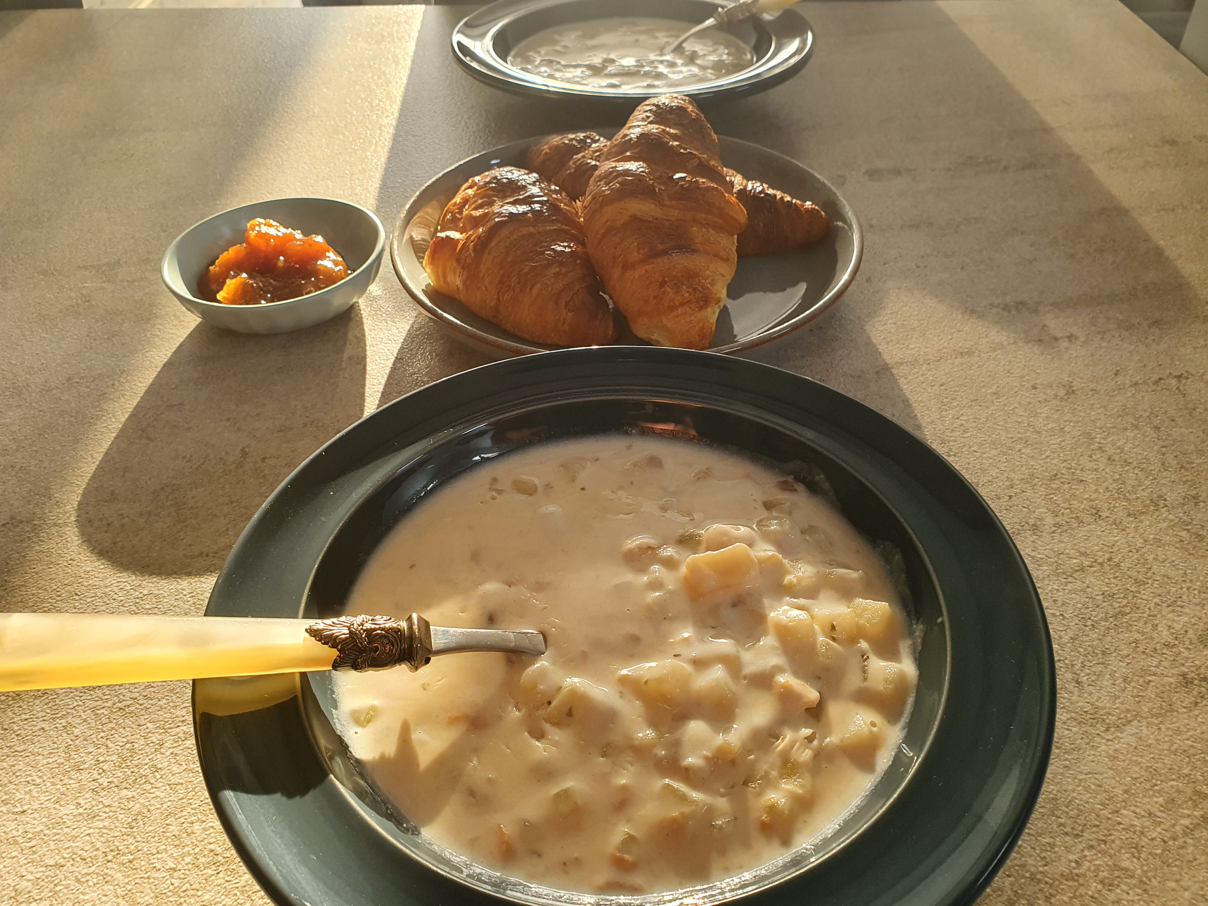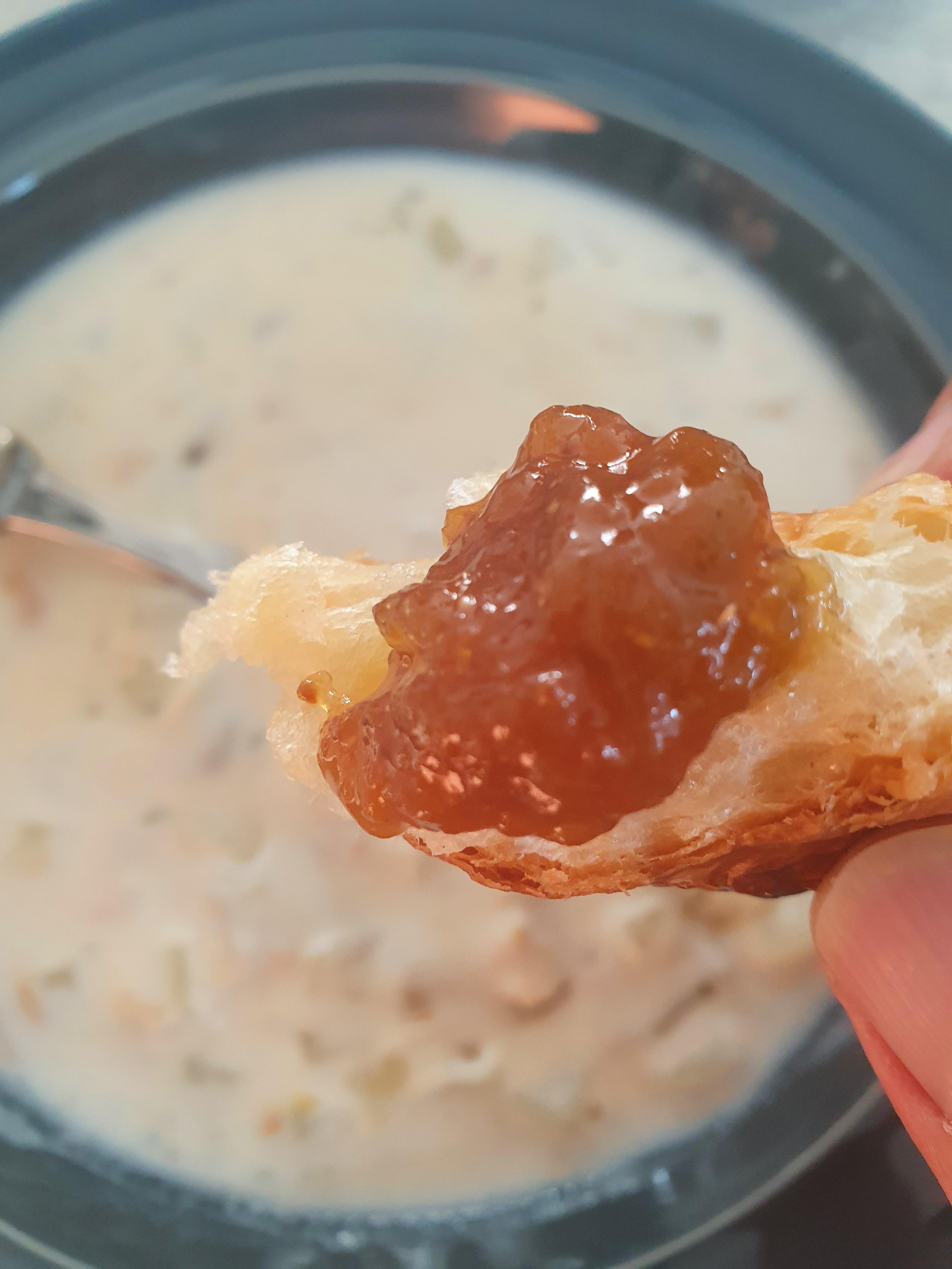 켐벨 청키 조개 수프와 크로아상을 한번에 먹은 샷~!, 지인찬스로 얻은 무화과잼과 함께 먹는 조개스프 샷~!^^ 아주 맛있게 잘 먹은 아침이네요~^^ 아... 이놈의 배는 어찌합니까.... 맛있게 먹으면 자꾸 더 넣으라고 신호를 보내오네요.