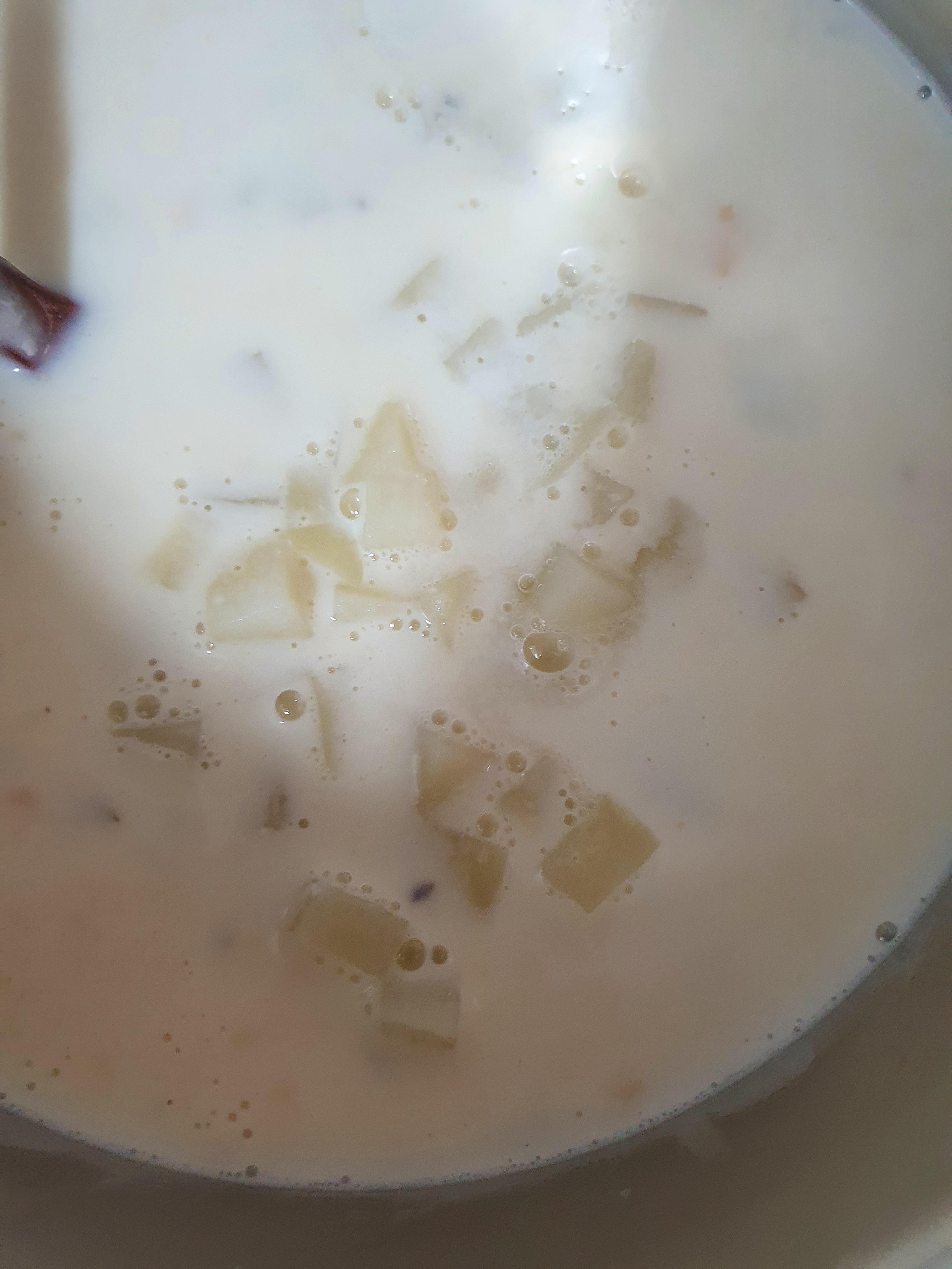 캔을 Open 해 보면 수프 국물만 들어가 있는 줄 알았는데, 건더기들이 엄청 들어가 있어요~ 하얀색이라 구분이 되진 않지만 세부 정보 보시면 , 감자, 대합 살 등등이 풍부히 들어가 있는 모습입니다. 자 하지만, 셋이서 먹어야 하기에 전 감자를 미리 삶아서 준비하였어요. 또한, 우유도 같이 넣어주어야 한답니다. ~ 이유가 무엇일까요~?