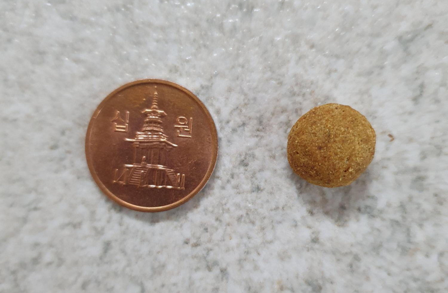 십원짜리 동전과 비교해본 샷인데 , 참고가 되었으면 좋겠습니다. 알이크다보니 소화가 잘 되지 않는지, 성분탓인지 하루의 대변이 토끼가 싸는 것 마냥 짜잘하게 나오고 평소의 변과는 확연히 다른 모습입니다.