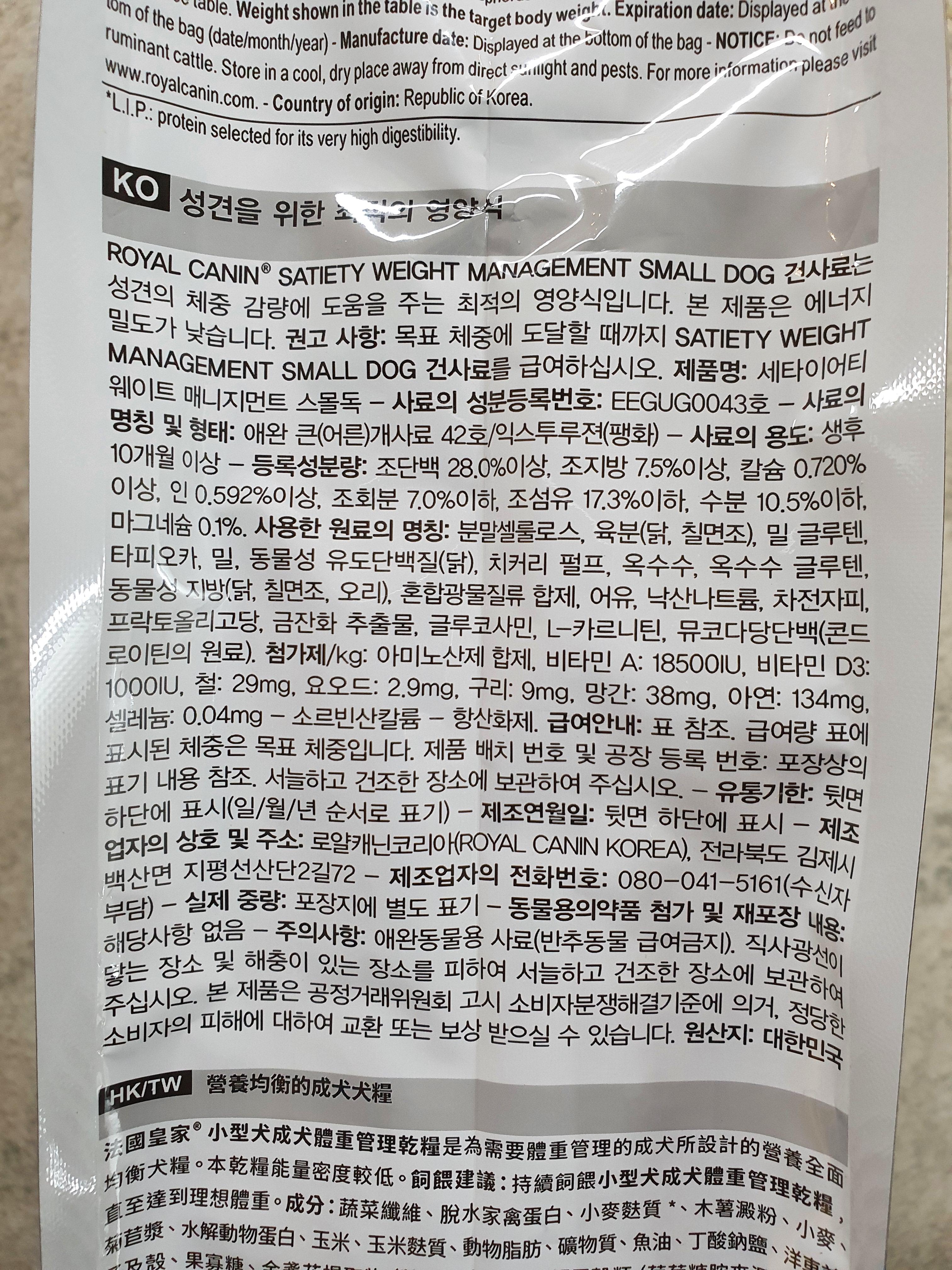 로얄캐닌 회사정보과 영양정보등이 적혀 있네요~ ^^ 일단 저나 또한 다이어트가 필요한 반려견들에게 필요한 가장 중요한 포인트인 얼마나 사료를 급여해야 하는지... 알아봐야겠습니다.