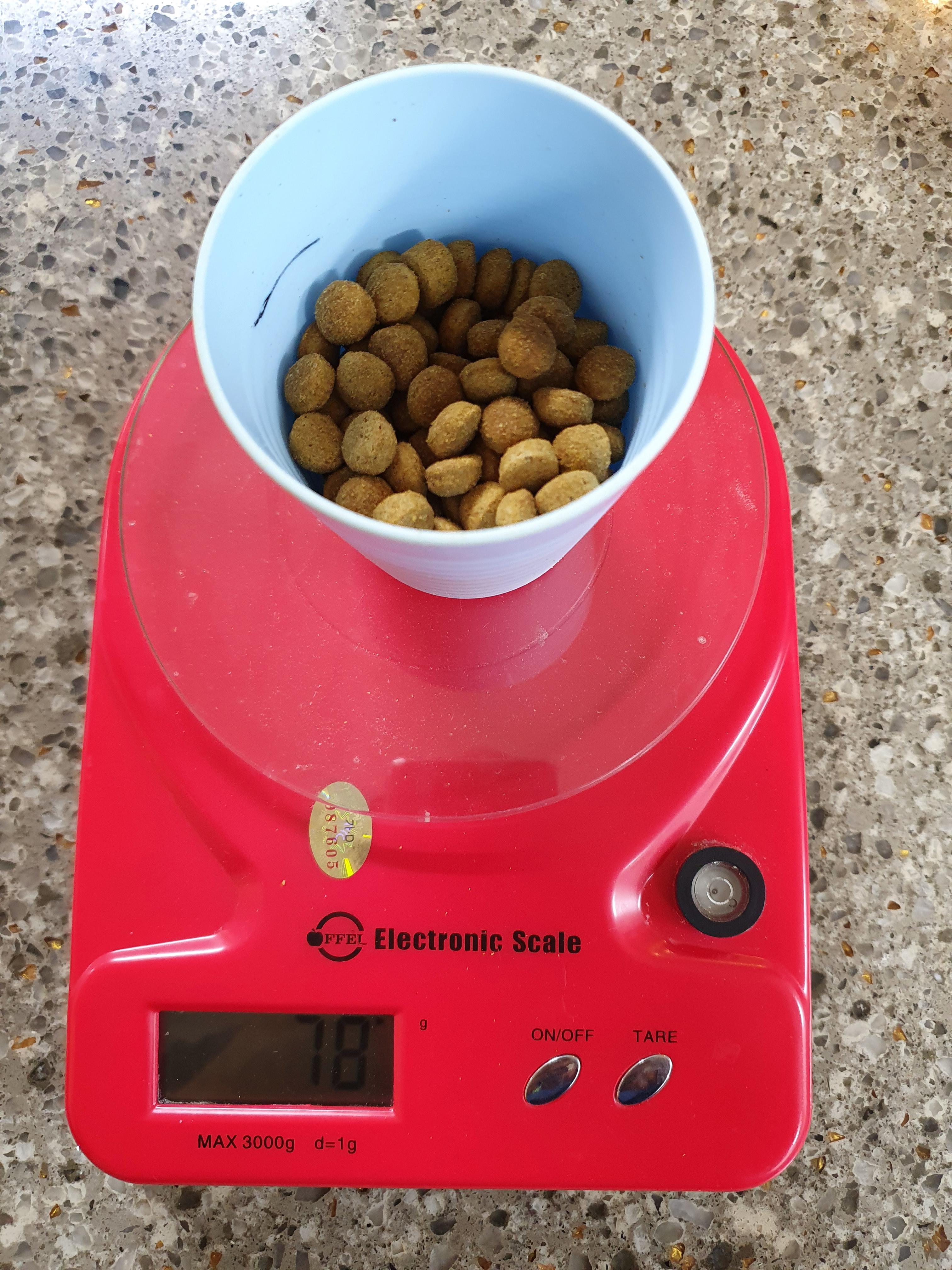 그래서 지금은 적정체중에 맞추어 주기 위해서 일일 하루 95g 정도 주기위해 급여하고 있습니다. (한끼에 50g정도)