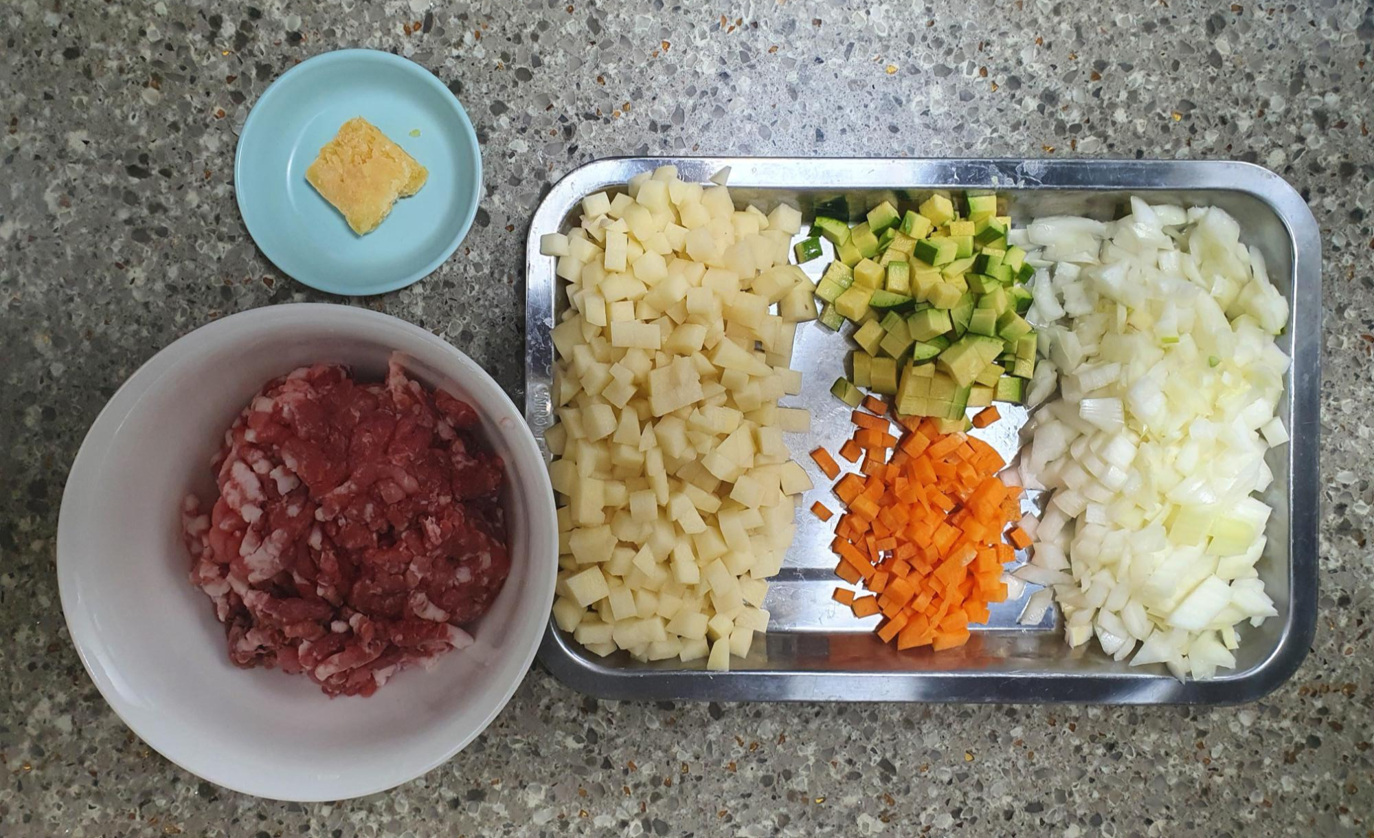 일단 어른들이 짜장밥을 먹을 때에는 큼직큼직한 야채로 구성이 되어야 하는데 , 아이와 같이 먹다 보니 약간 작은 크기로 야채를 다듬어 주었고요. 고기 또한 큼직하면 아이가 씹는데 어려움이 있기 때문에 고기를 갈아서 준비했답니다.
