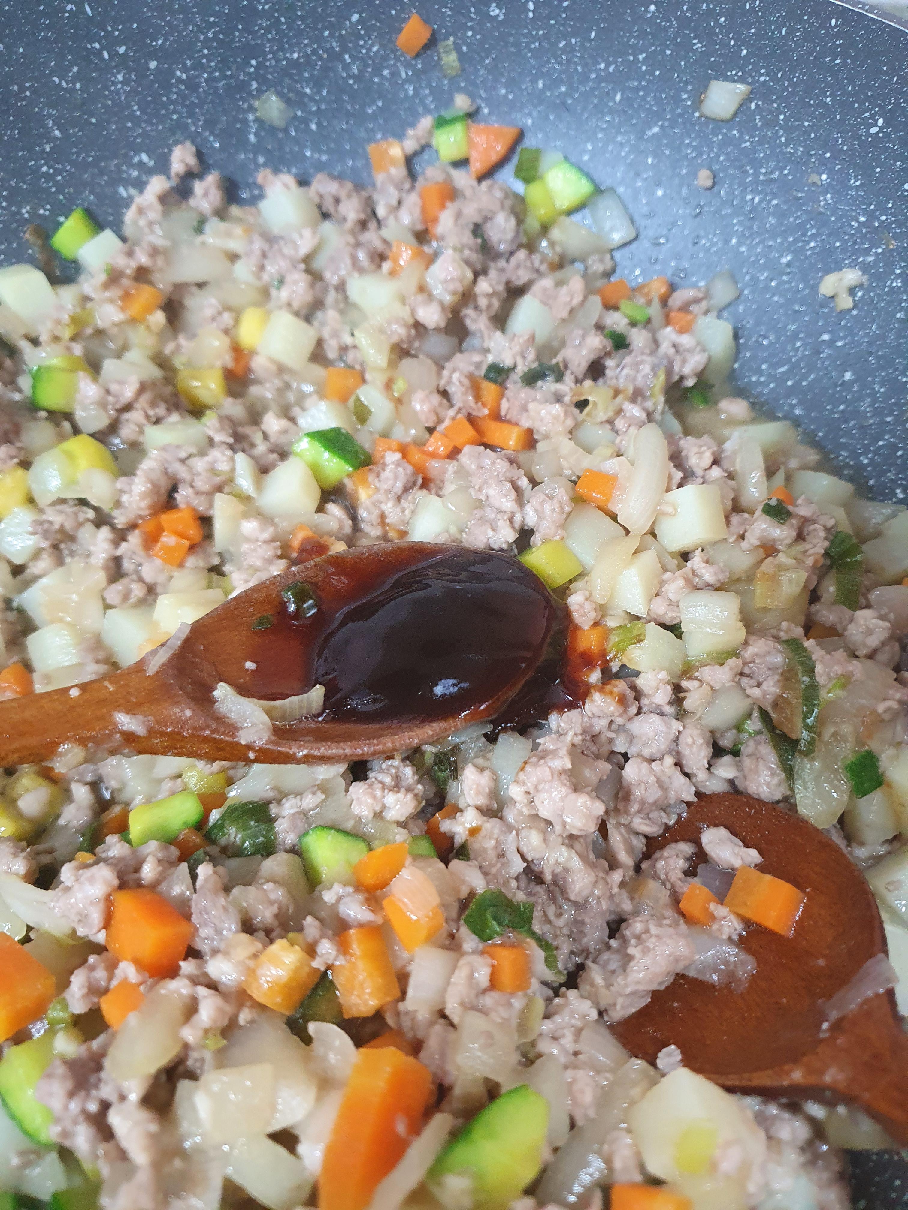 다진마늘 / 대파 / 양파 1개 / 당근 1/4개 / 호박 1/3개 / 감자 1개 반 / 다진 고기 (앞다리살 300g) / 갓뚜기 짜장 100g / 물 700ml / 굴소스 2/3 수저