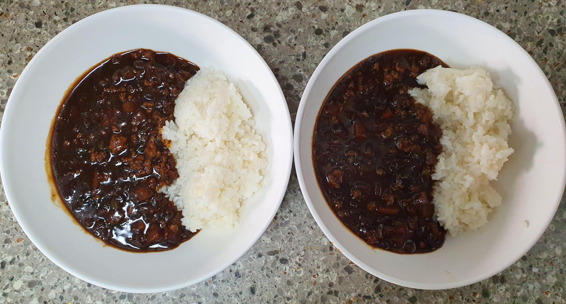 이렇게 아이도 함께 먹을 수 있는 자잘한 크기의 야채가 담긴 짜장밥이 완성되었습니다. 아이 짜장밥은 미리 덜어서 식힌 후에 먹여야 했기에.... 사진을 같이 찍지는 못했네요~.