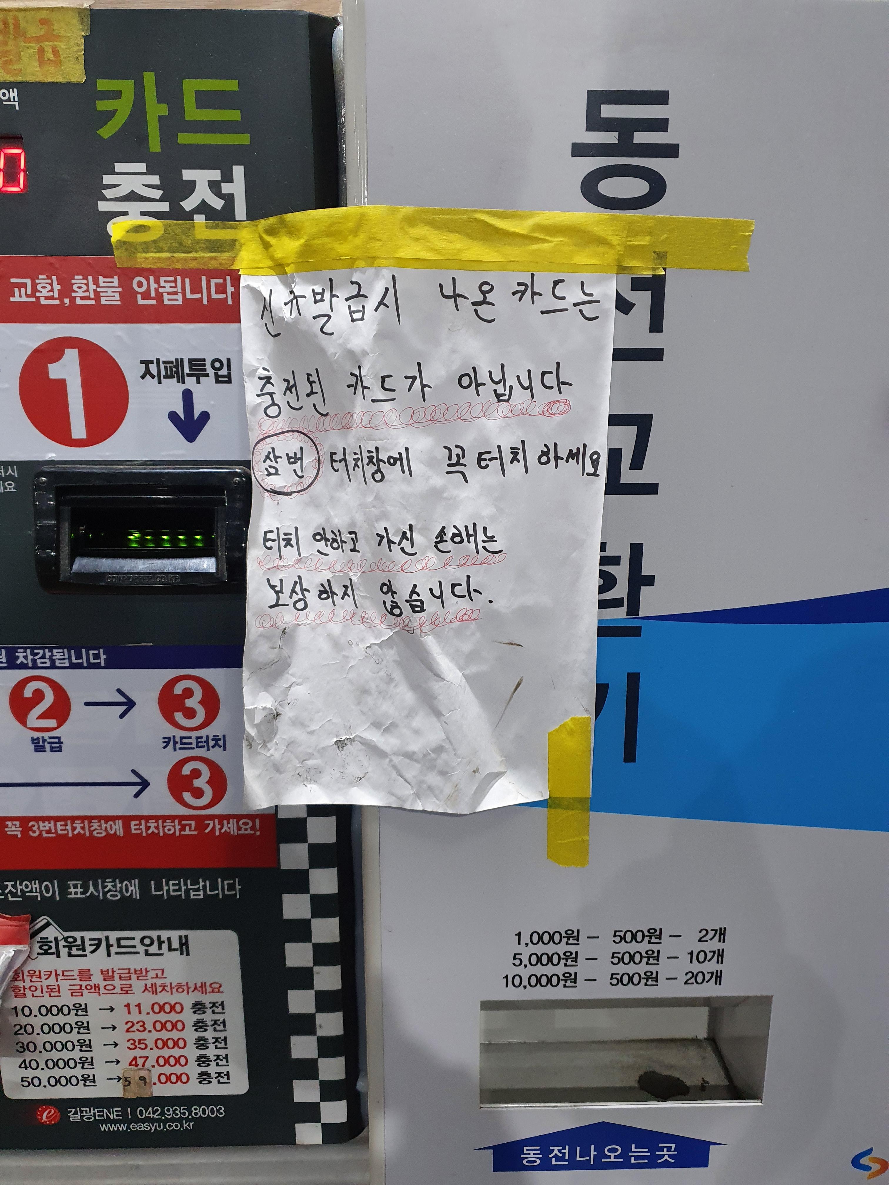 만약 카드 충전하신다면 경고 메시지 부착되어 있는 것처럼 카드 발급한 후 꼭 잔여 금액을 충전카드 위치에 터치해야 합니다. 잊지 말고 해 주시길 바라요~ 꼭꼭~! (다른 사람이 가져가면 손해잖아요)