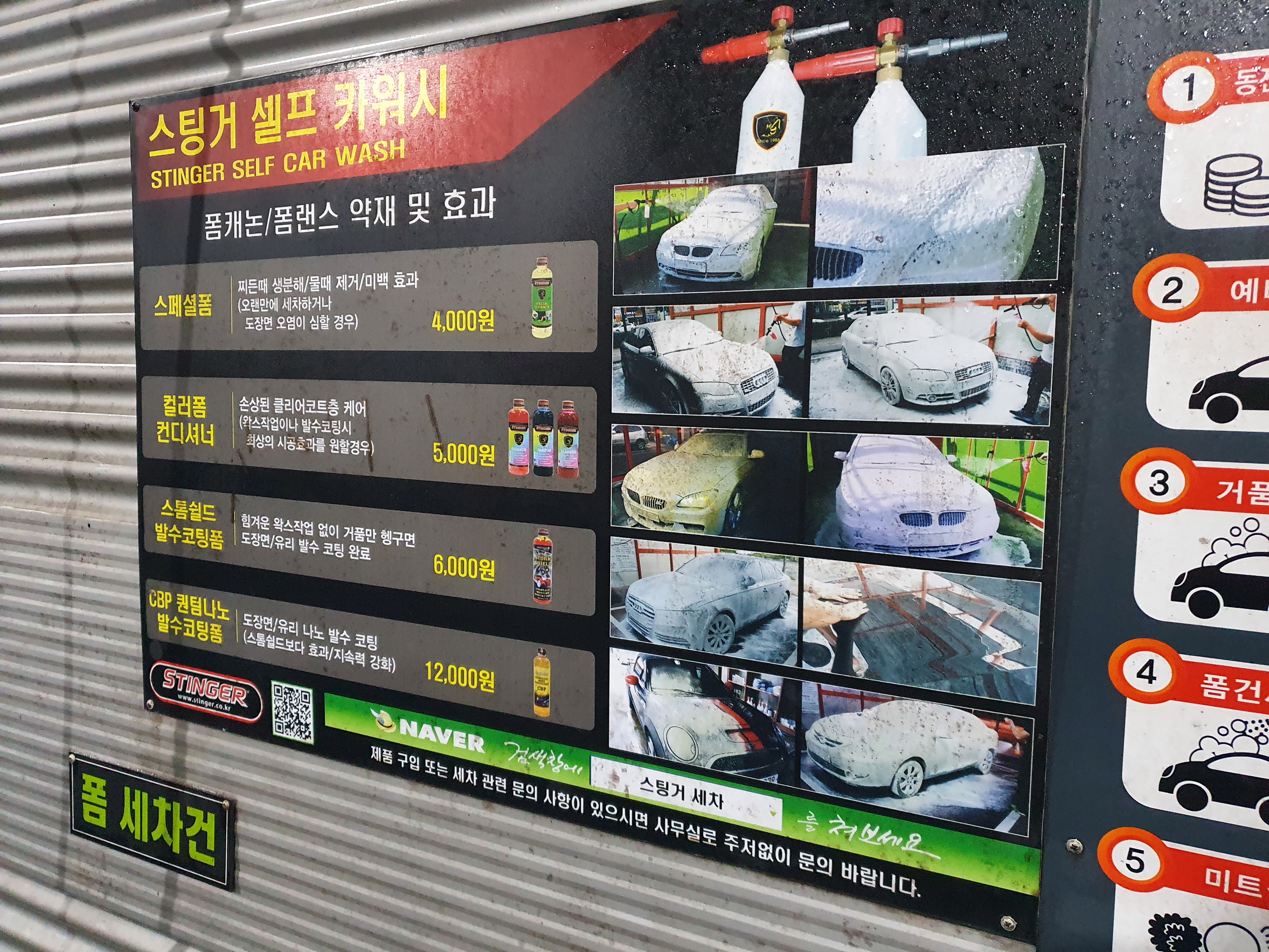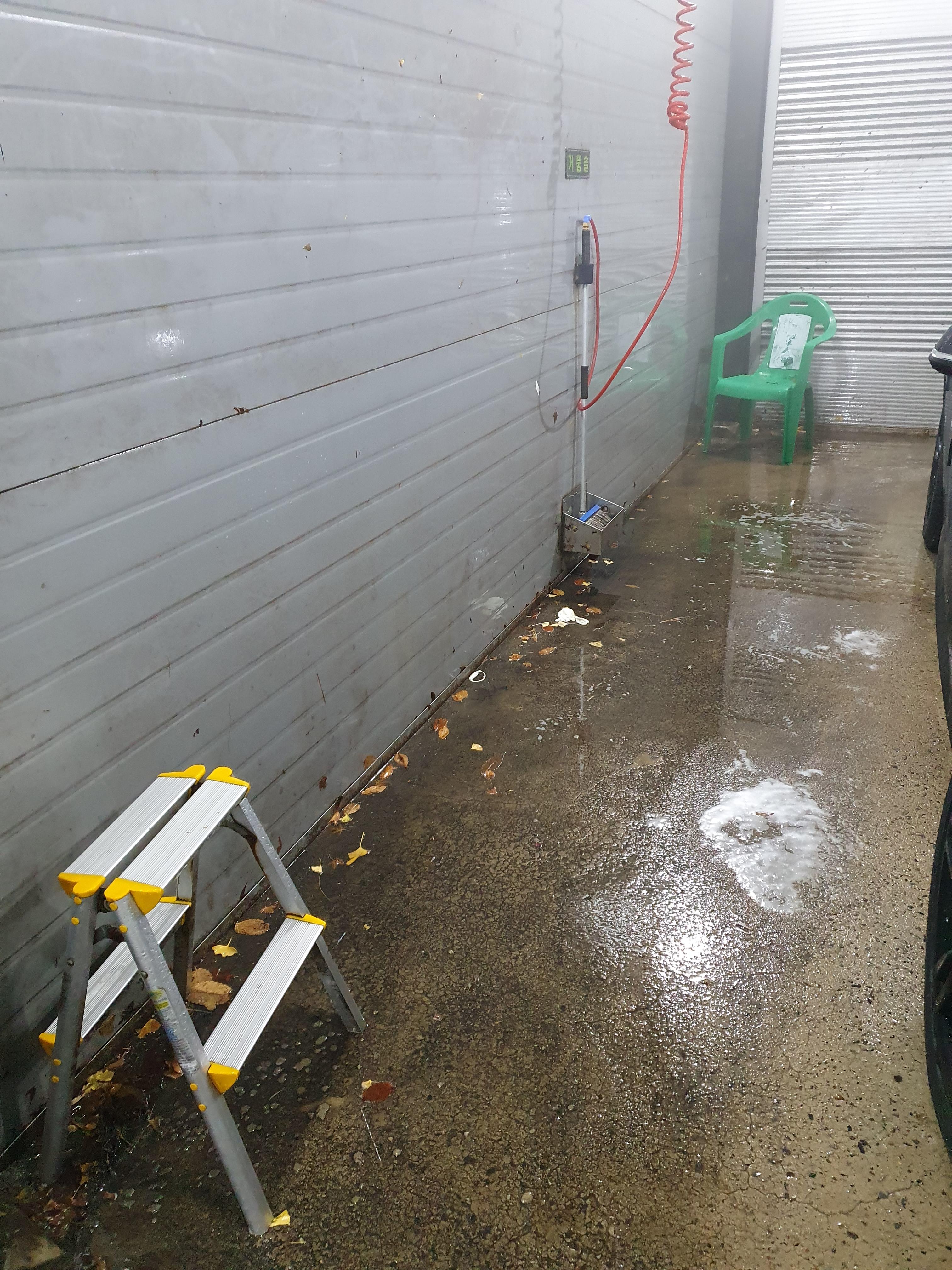 왼편 벽면에는 세차에 쓰는 거품 솔이 있고요, 오른편 벽면에는 폼건 및 물세차에 필요한 건이 있습니다. 세차 칸마다 높은 차를 닦을 수 있도록 전용 사다리 및 의자가 배치되어있는 점이 좋습니다.