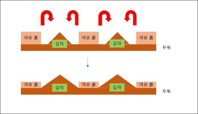처음 심을 때 북주기를 할 흙이 많이 필요하다는 사실을 파악하고, 주변에 흙이 여유가 있도록 만들어주거나 고민을 해봐야 할 필요가 분명 있습니다.