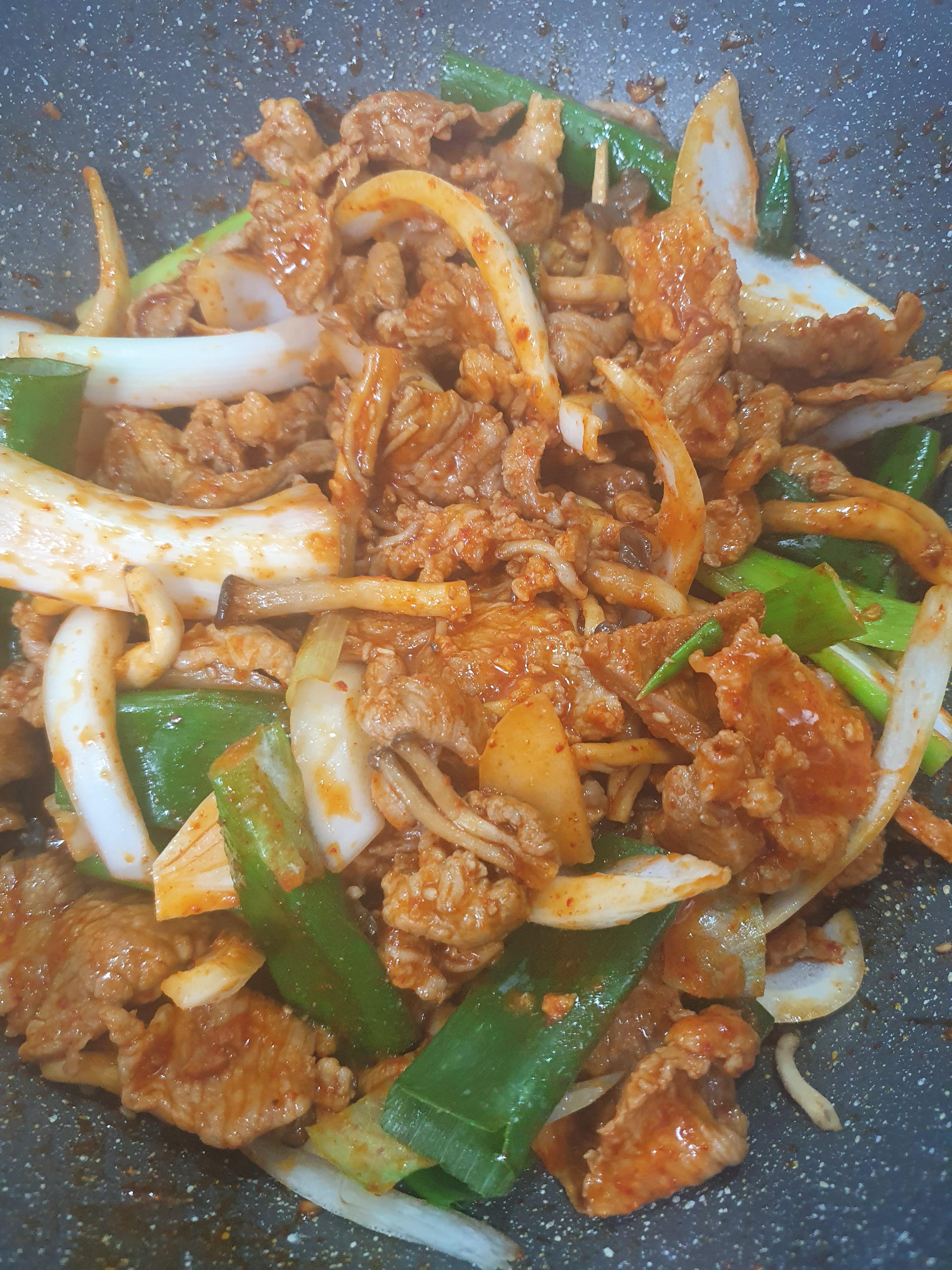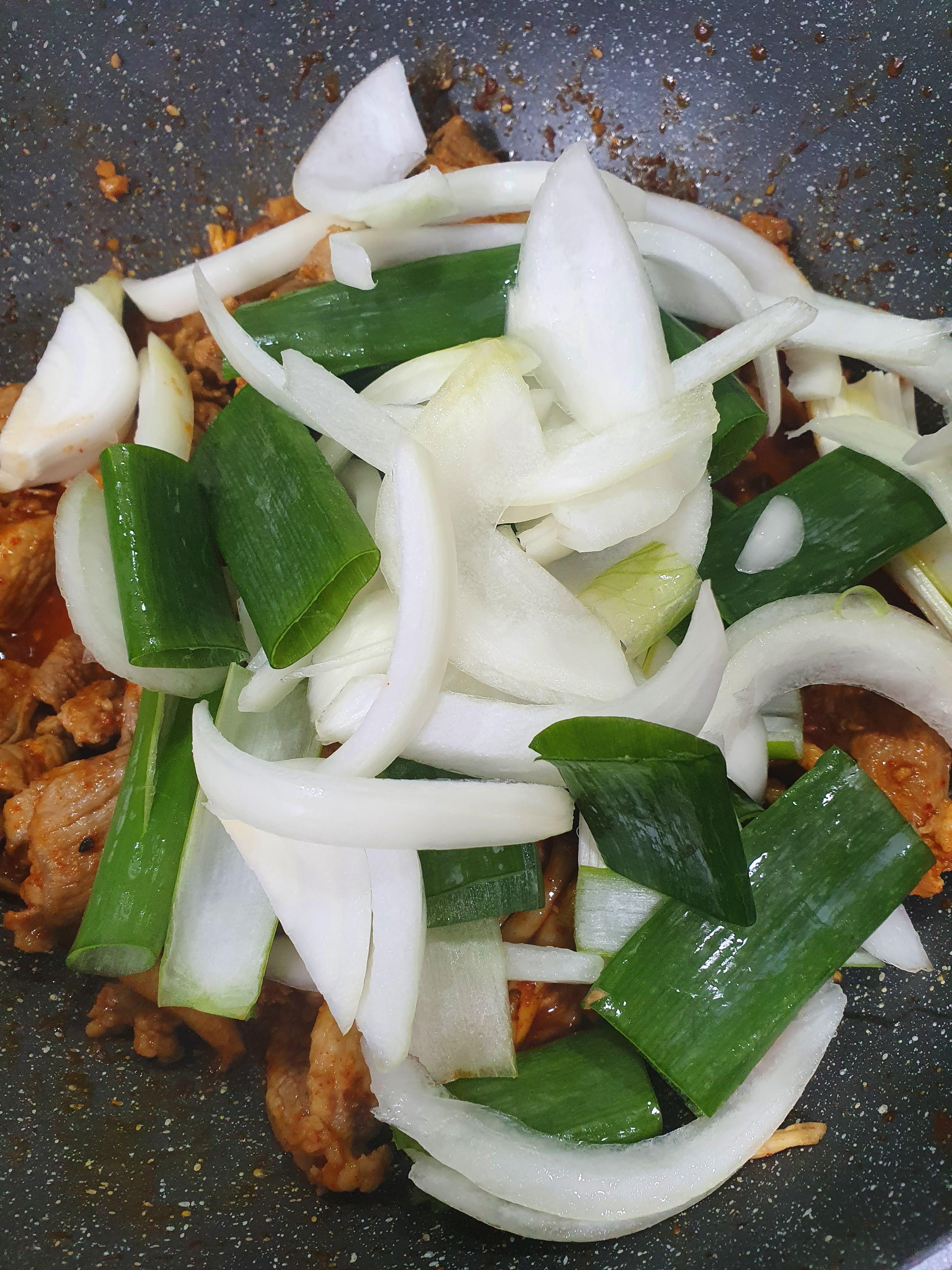 고기와 양념이 버물어져 볶기가 어느 정도 완성되고, 강한 불로 볶다보면 수분이 없어지는 시간이 와요. 그때 양파와 대파를 넣어주시면 됩니다. 익힘 정도는 양파가 어느정도 힘이 없어질때 쯤까지 볶아주시면 됩니다.