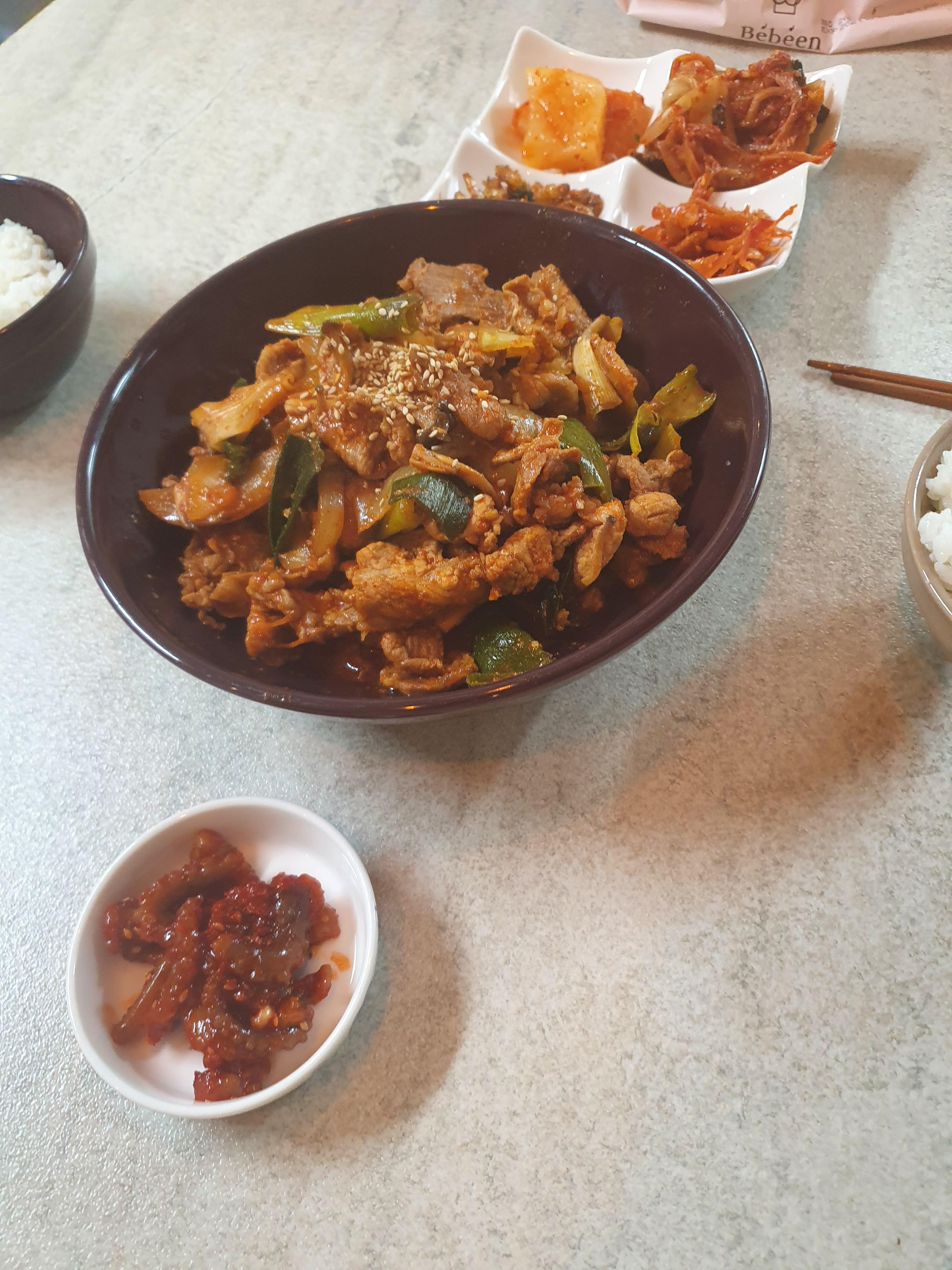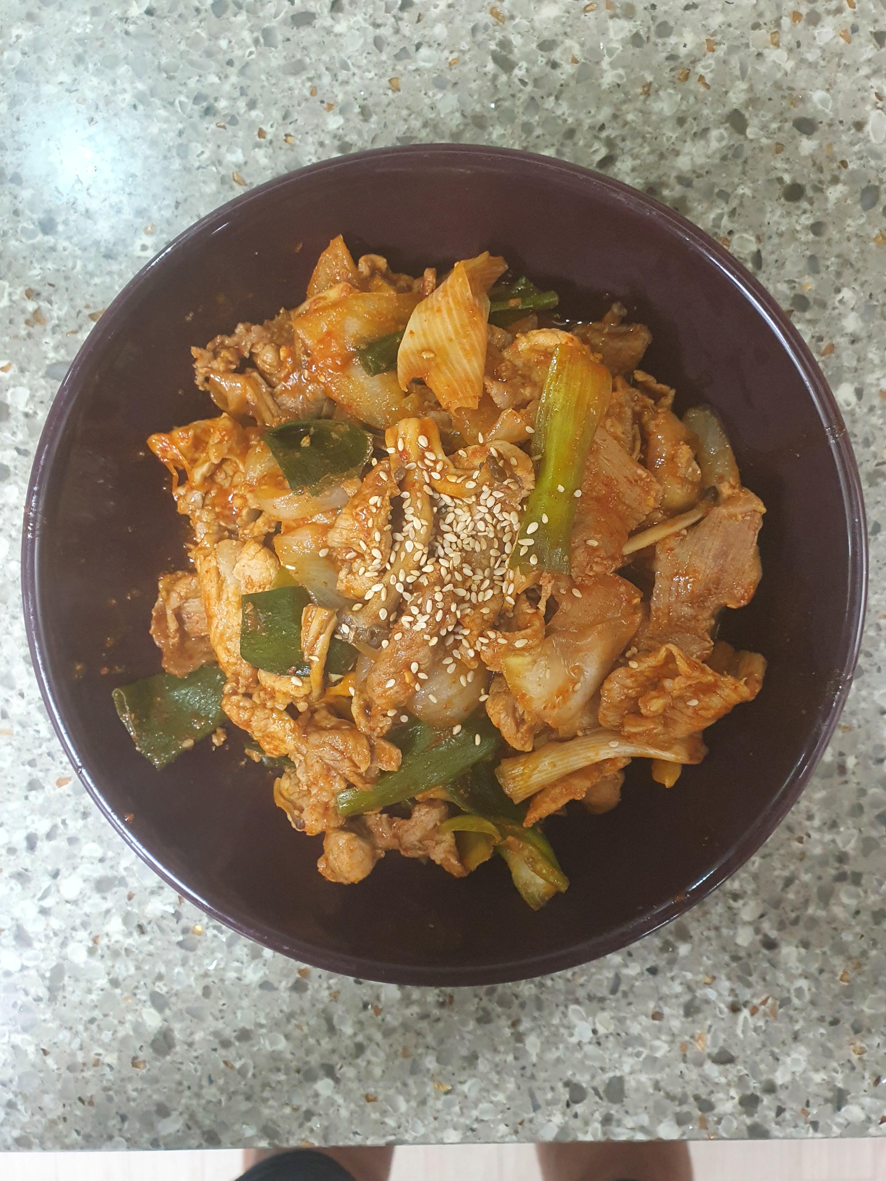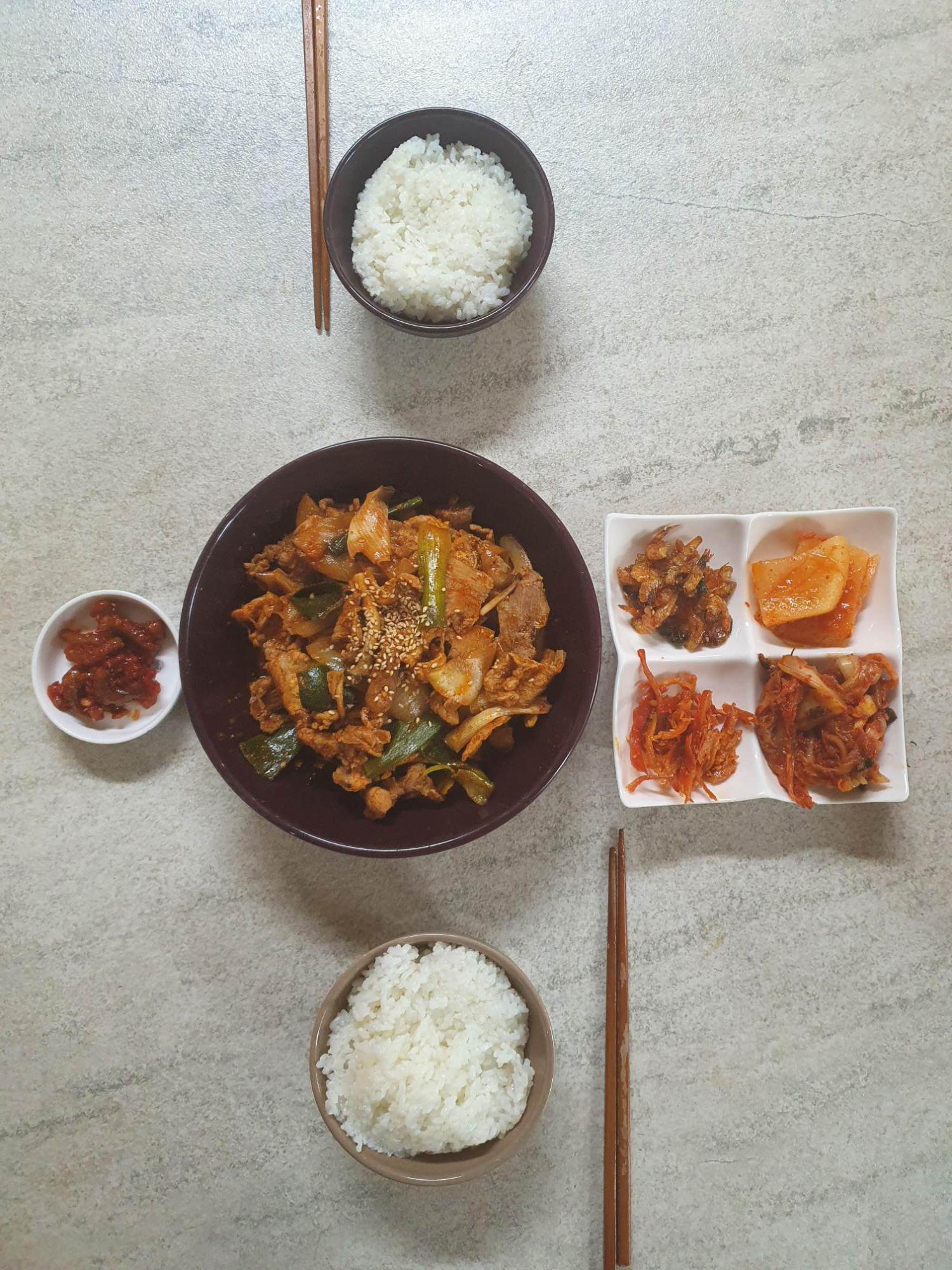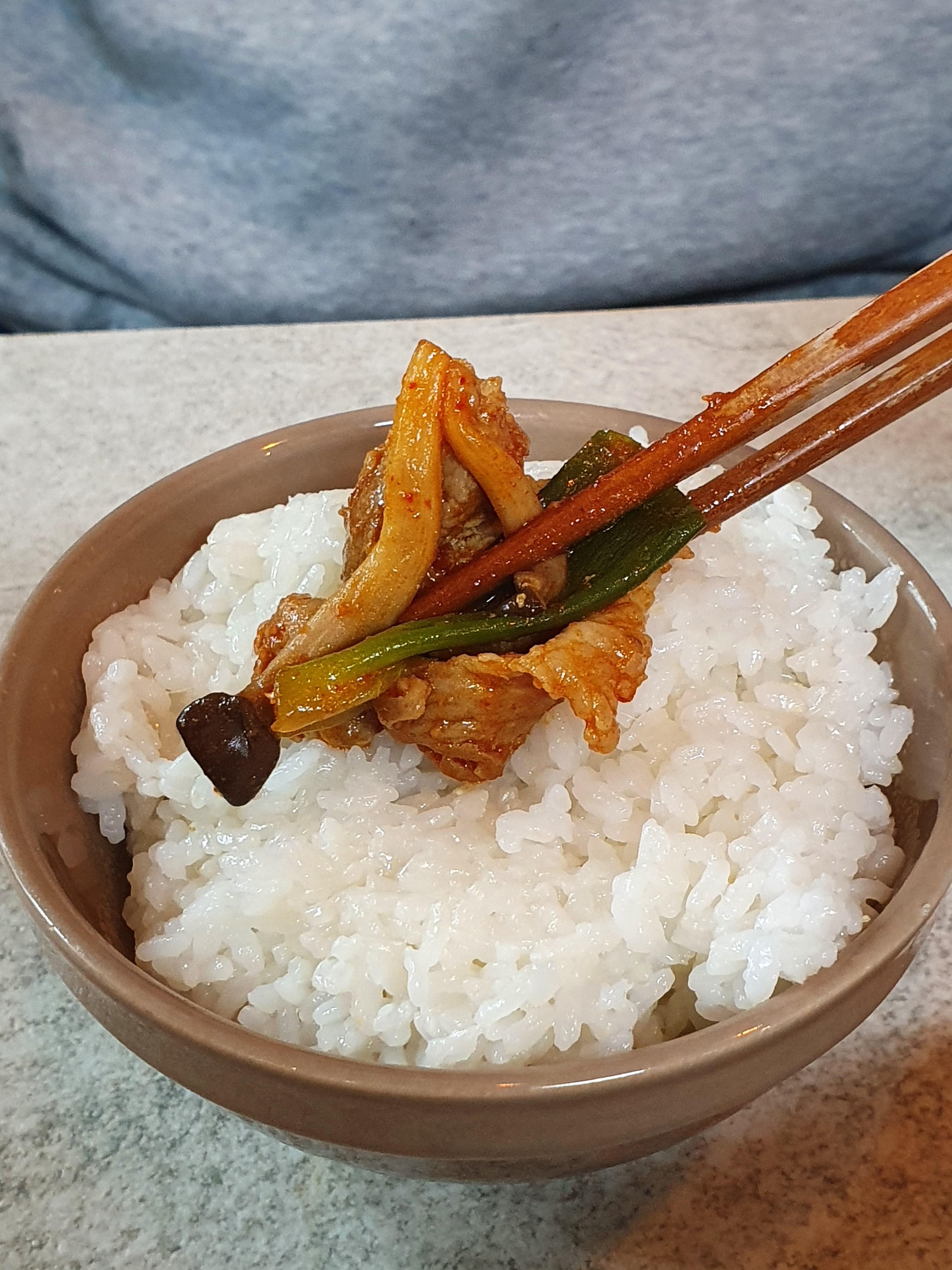 따뜻한 하얀 밥과 매콤하면서 달짝지근한 맛이 일품인 제육볶음 완성입니다~ 와이프님과 한 끼 식사.. 화려할 필요 있을까요~!? 제육볶음 하나면 끝이죠~!^^
