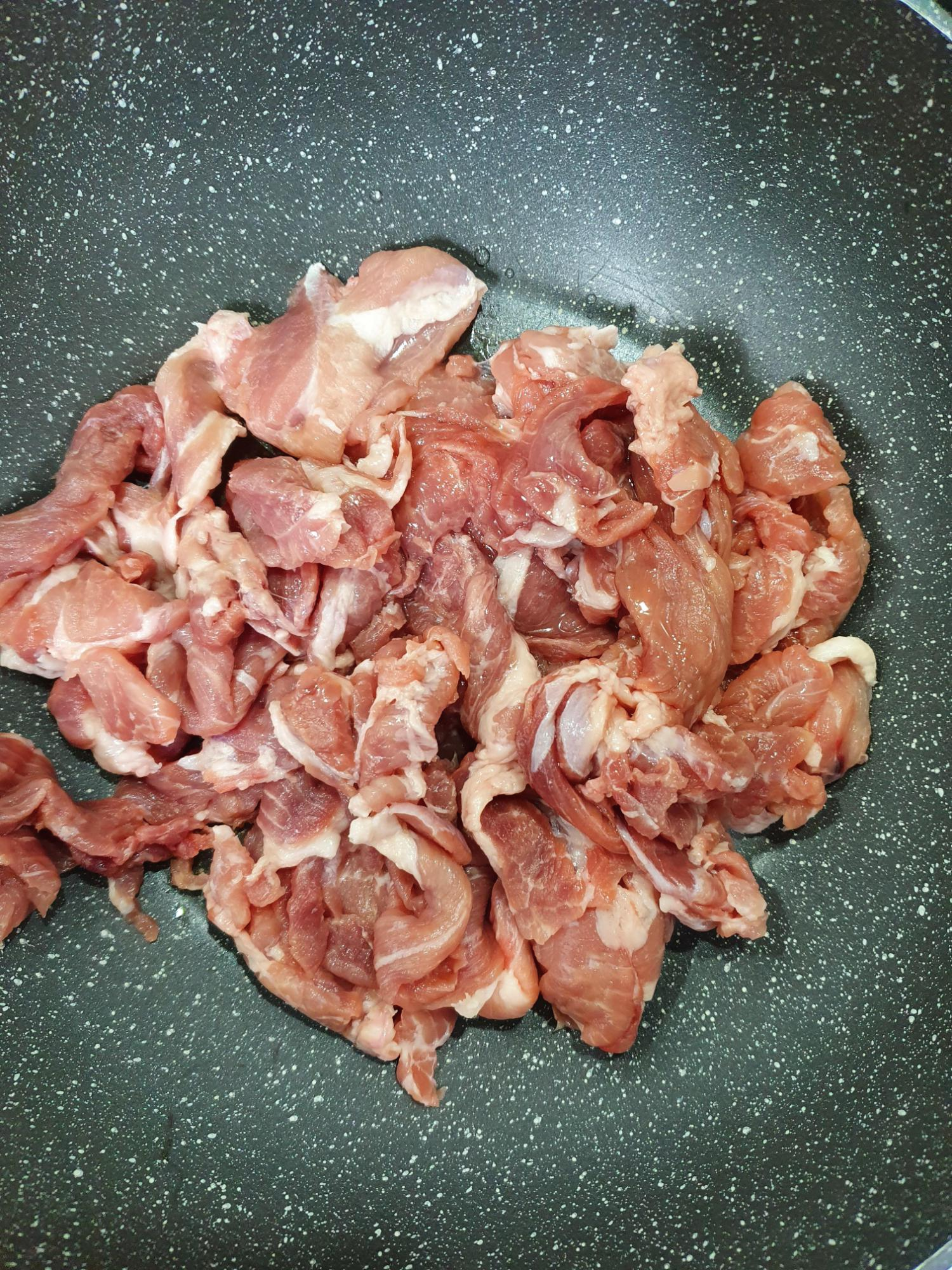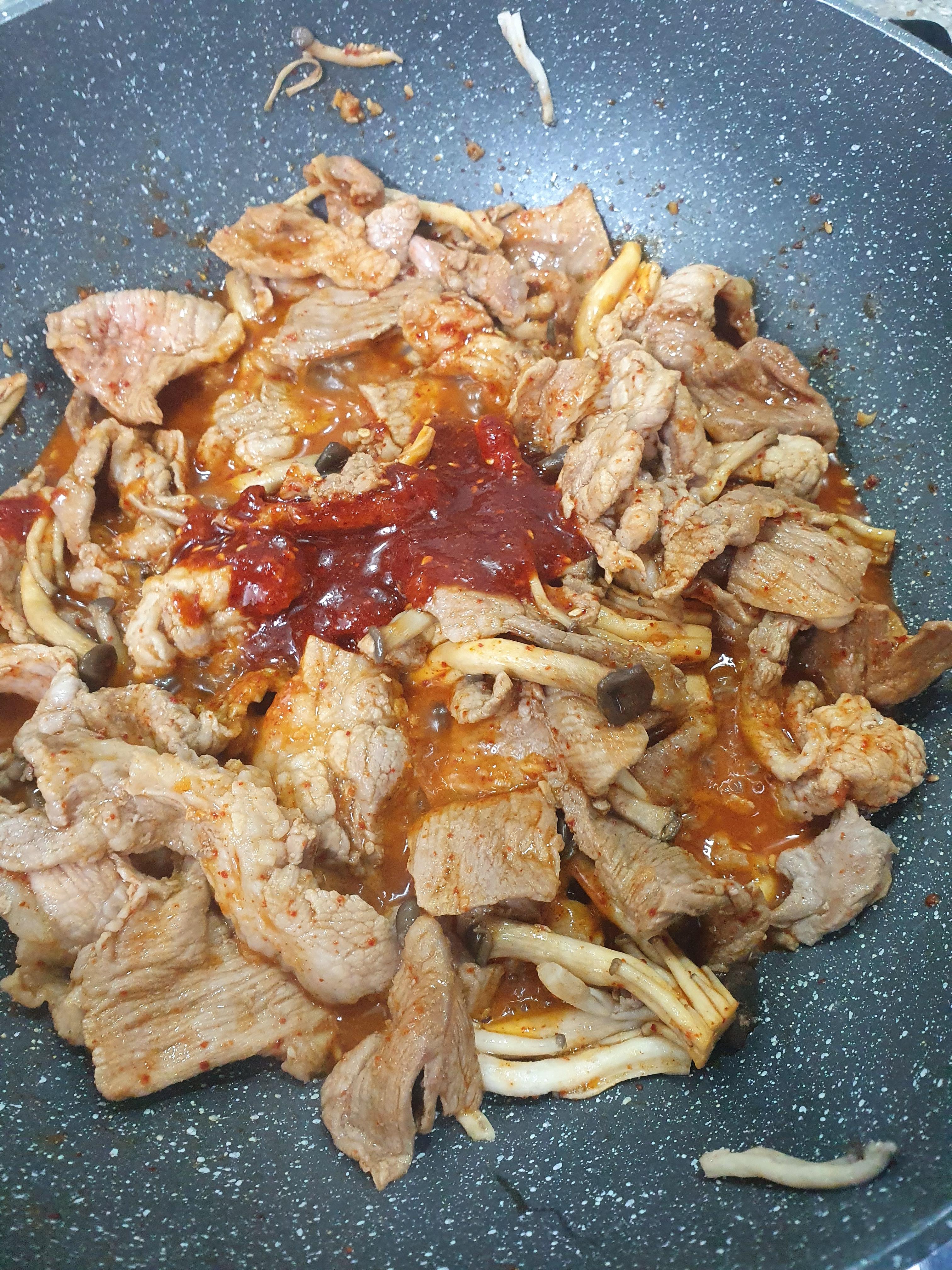 고기와 같이 느타리 버섯을 섞는 이유는 앞으로 넣어야 할 채소/양파 등에서도 물이 나오는데, 버섯에서 볶으면서 나오는 물까지 생기면 제육볶음에 국물이 많아지기 때문에 고기와 느타리버섯을 동시에 볶음으로서 버섯에서 나오는 물을 증발시킬 생각입니다.