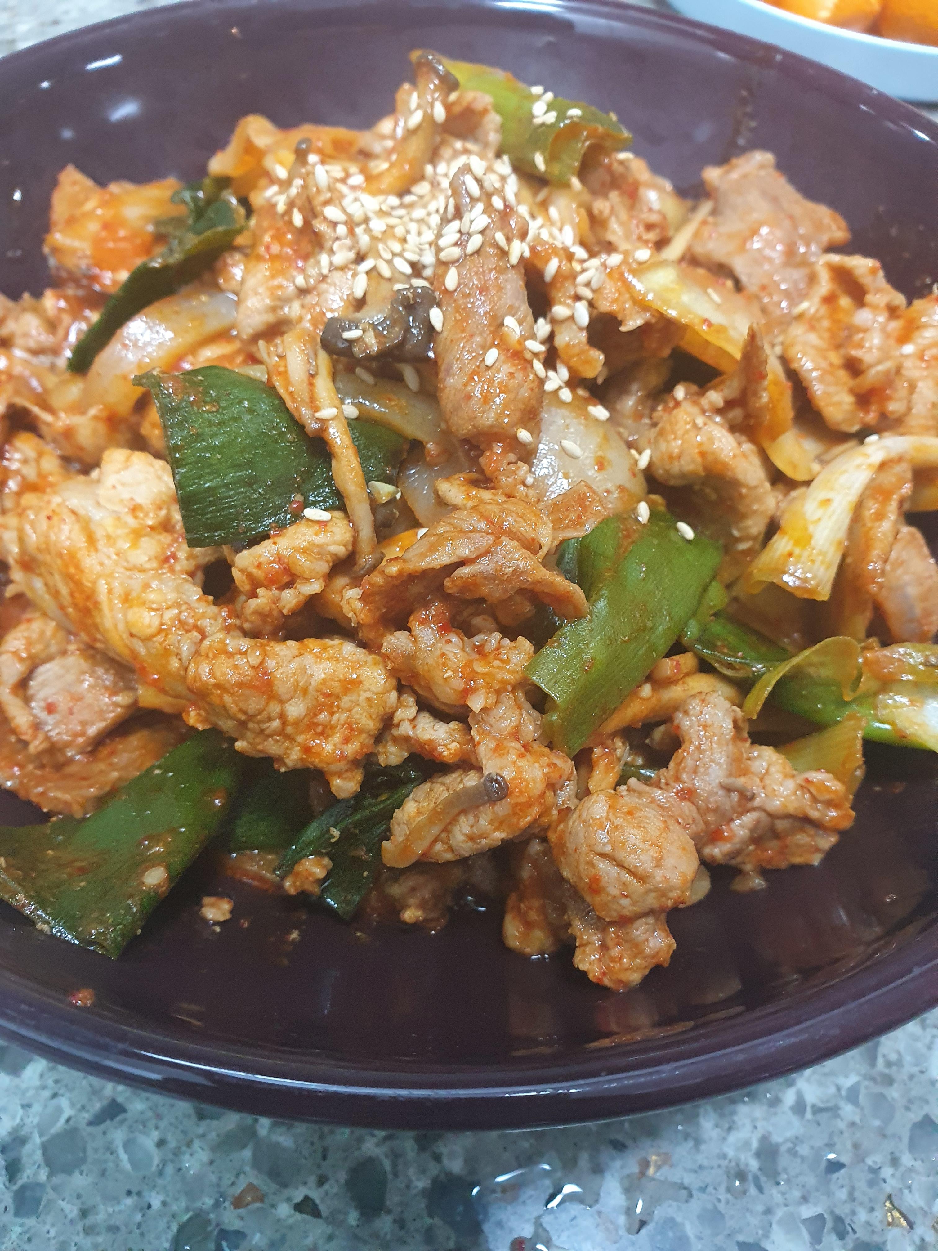 이렇게 통깨로 마무리해주면서 제육볶음은 손쉽게 끝났네요~ 이제 먹을 일만 남았습니다~ 아!~~ 빨리빨리 준비~!