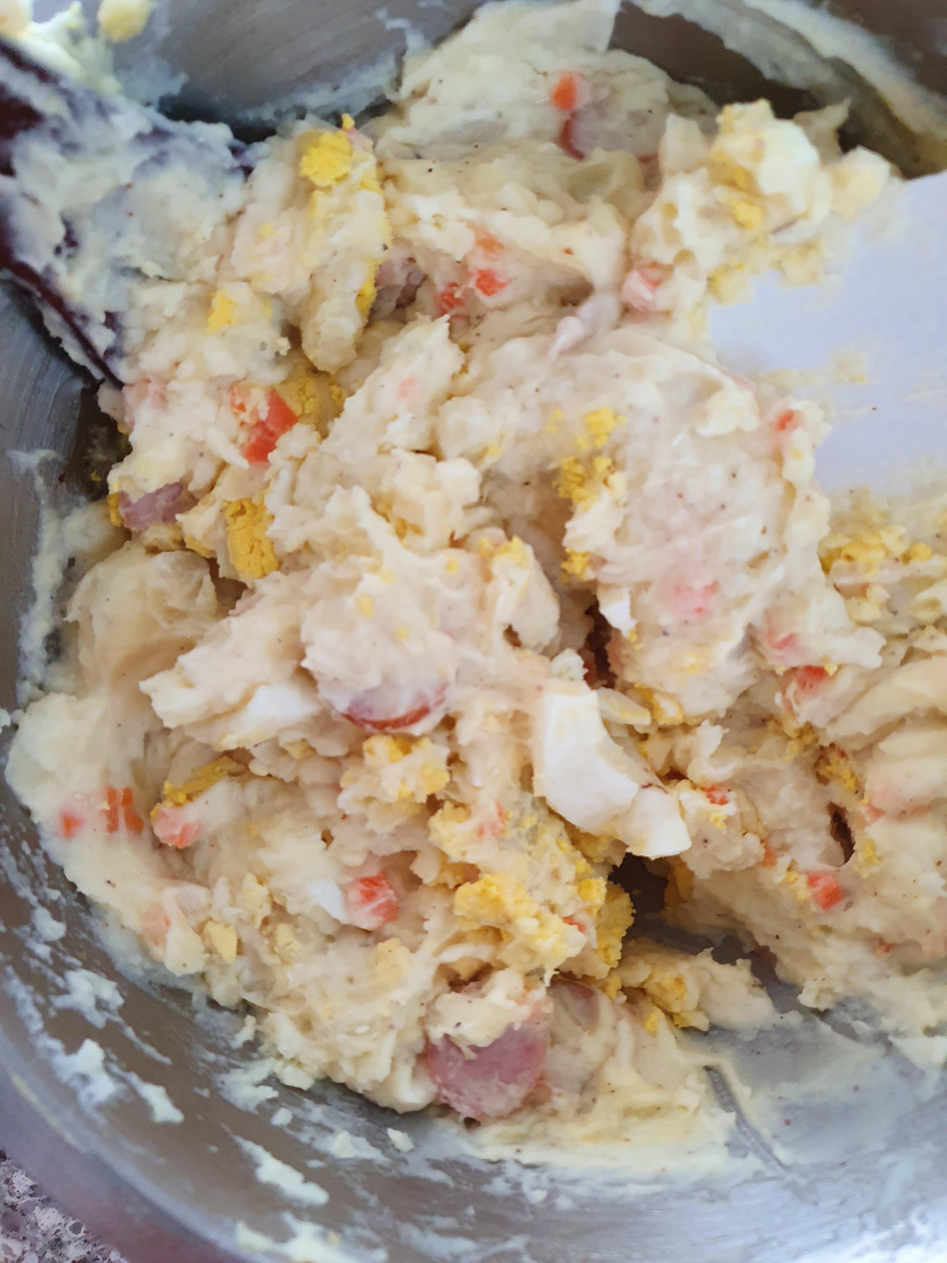 완숙으로 익혀진 삶은 달걀을 넣고 추가로 섞어주기 시작합니다. 저는 개인적으로 계란이 자잘하게 부서지는 것보다 큼지막하게 부서지는 것을 더 좋아해서 듬성듬성 계란을 으깨서 만들었어요.