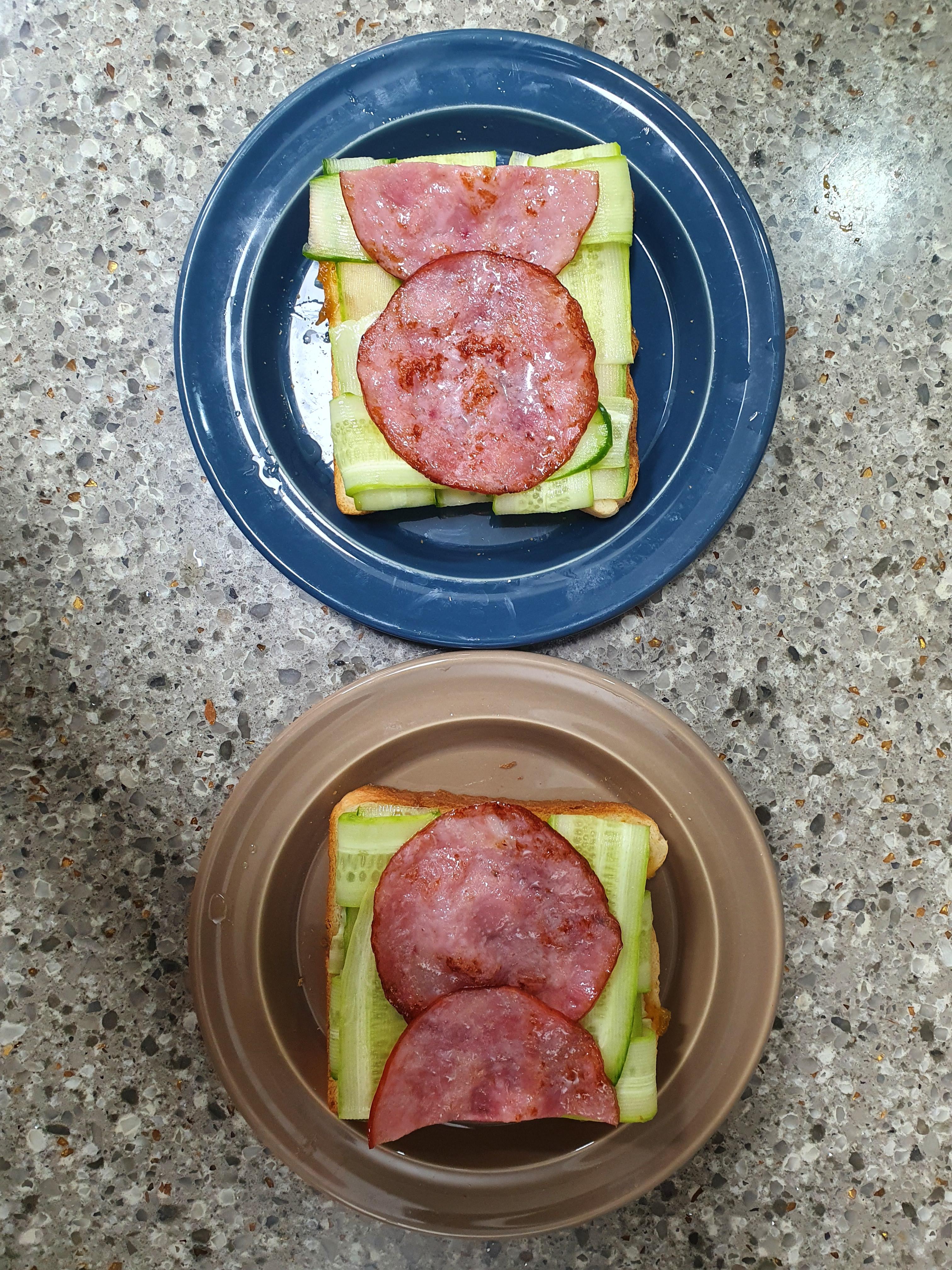 잼을 바른 빵 위에 준비한 슬라이스 햄과 오이를 플레이팅 합니다. 또 다른 반대쪽 식빵에는 만들어진 감자 샐러드를 올려주시면 좋겠네요~^^ 사진 참고 바랍니다.