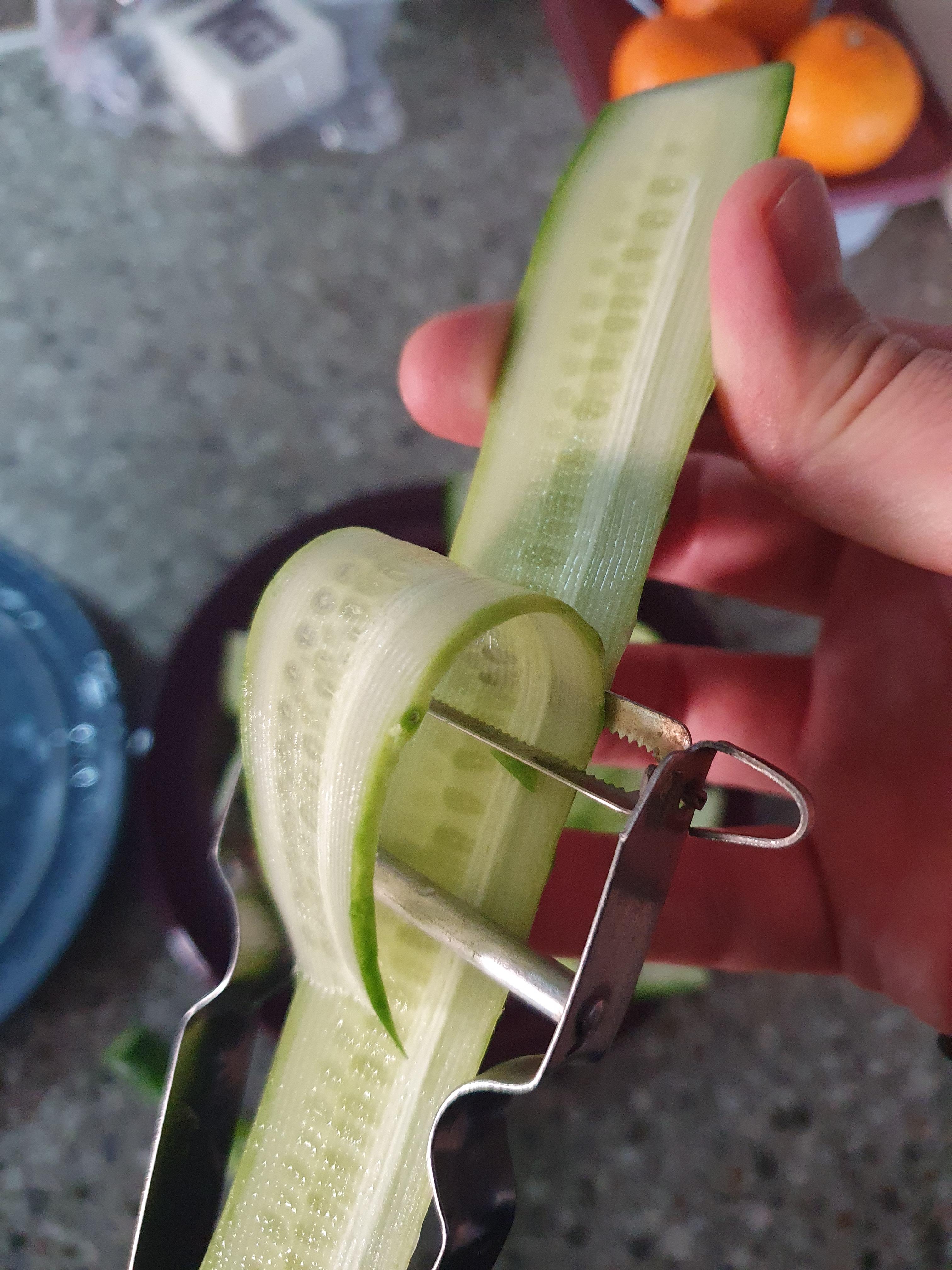오이의 양쪽 끝을 자른 다음 슬라이스로 길게~ 편으로 썰어 주세요~ 저처럼 도구를 이용해서 자르는 것을 추천드립니다.