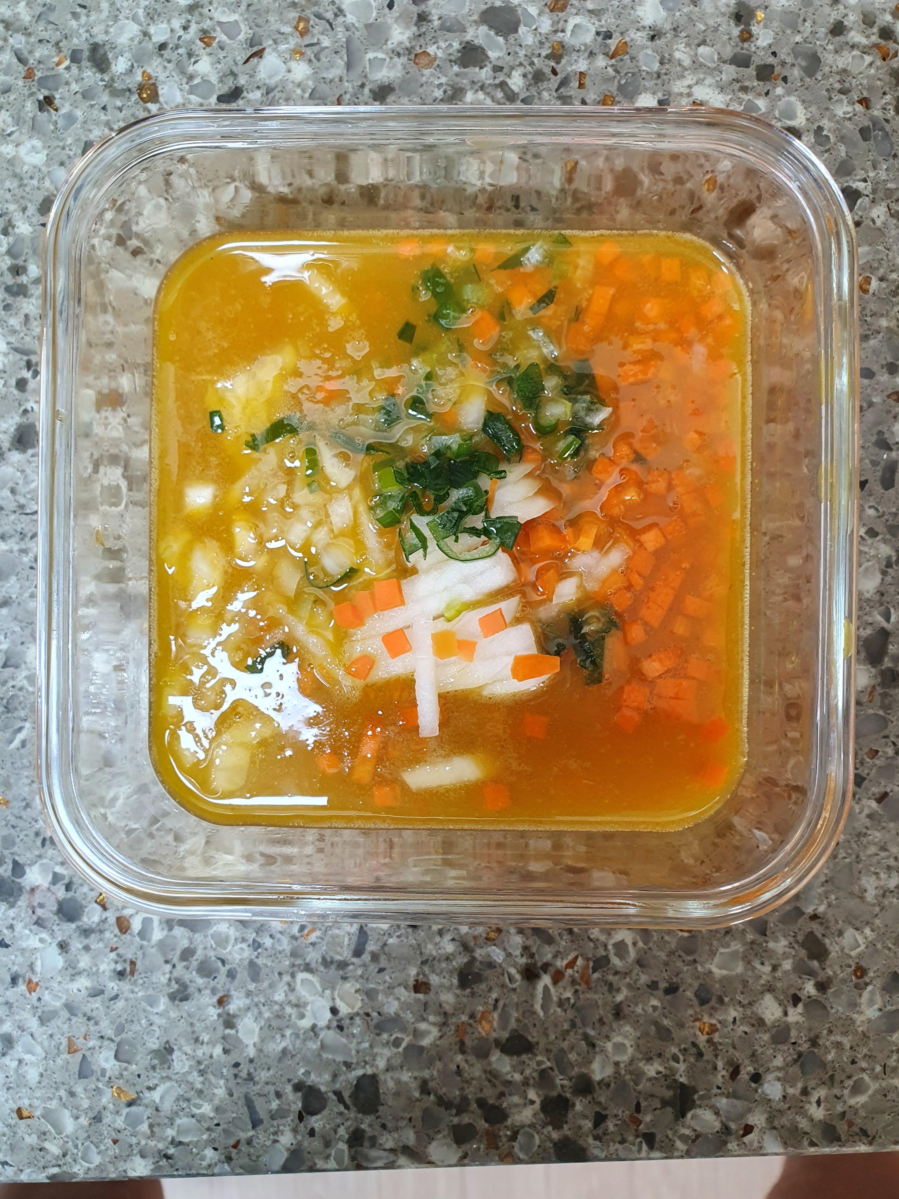 | 재료 준비 계란 3개 / 양파 1/4개 / 당근 1/5개 / 파 약간 / 다시육수 300ml / 새우젓 / 소금 |