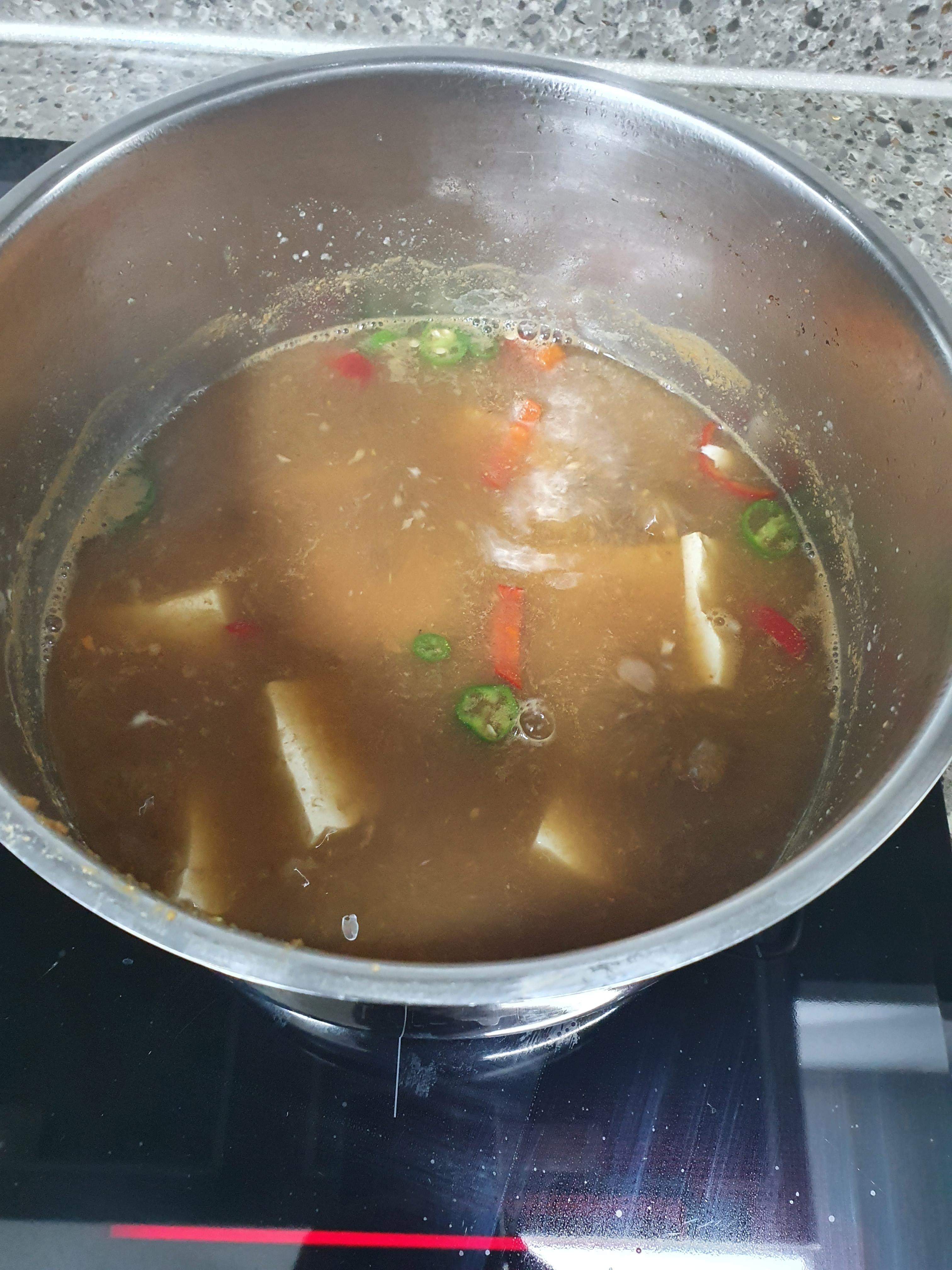 제 나름의 순서임을 참고해 주세요. 된장을 육수에 풀어 준 뒤 청양고추를 넣고 매콤한 맛을 육수에 실어 줍니다. 그리고 두부를 먼저 넣어요. 다른야채들보다 상대적으로 두부가 맛이 배는데 오래 걸리로 조금 끓이면 맛이 걷도는 두부도 있어서 두부먼저 넣고 부서지지않게 조심히 저어서 끓이는 편이에요~