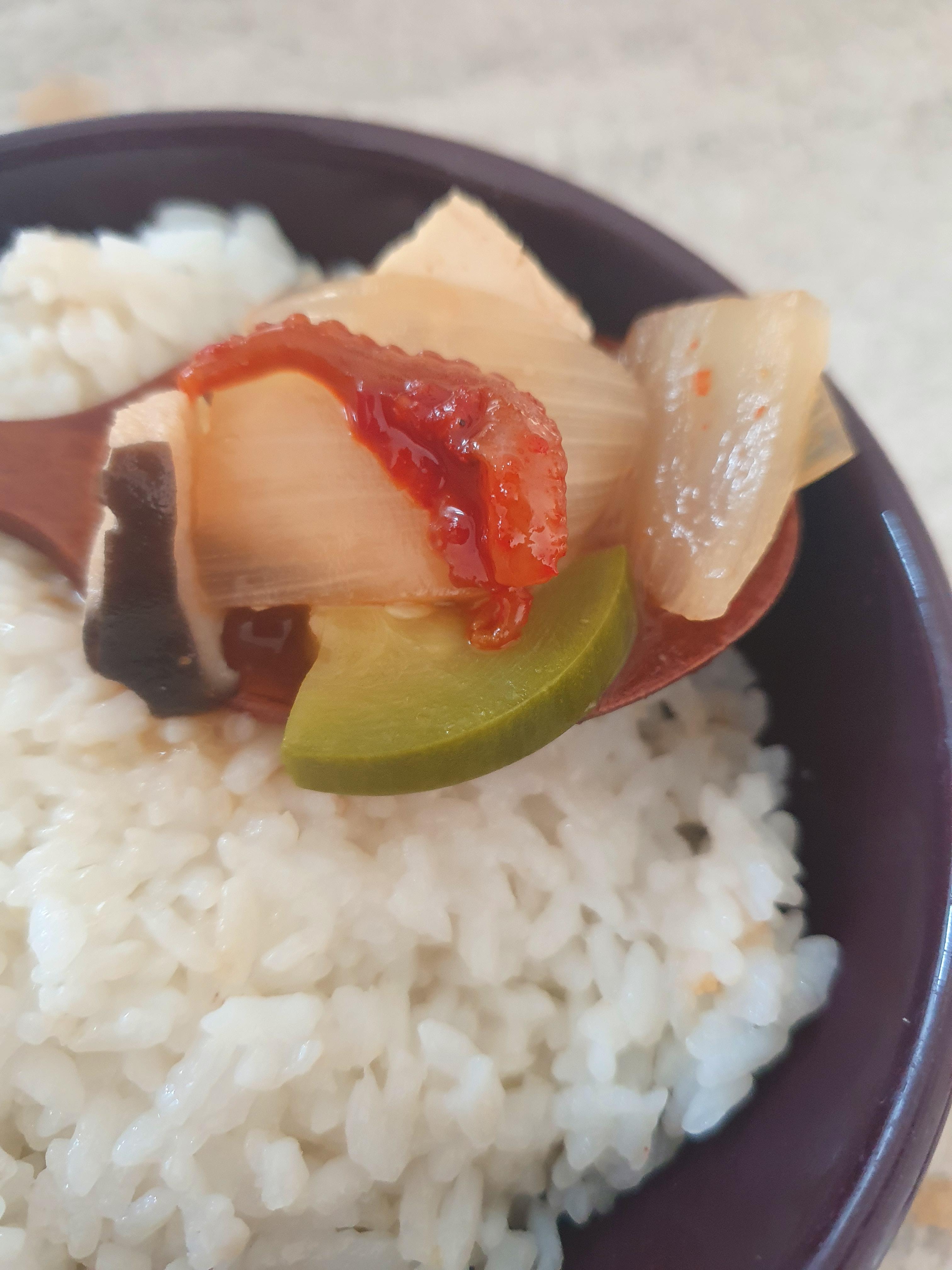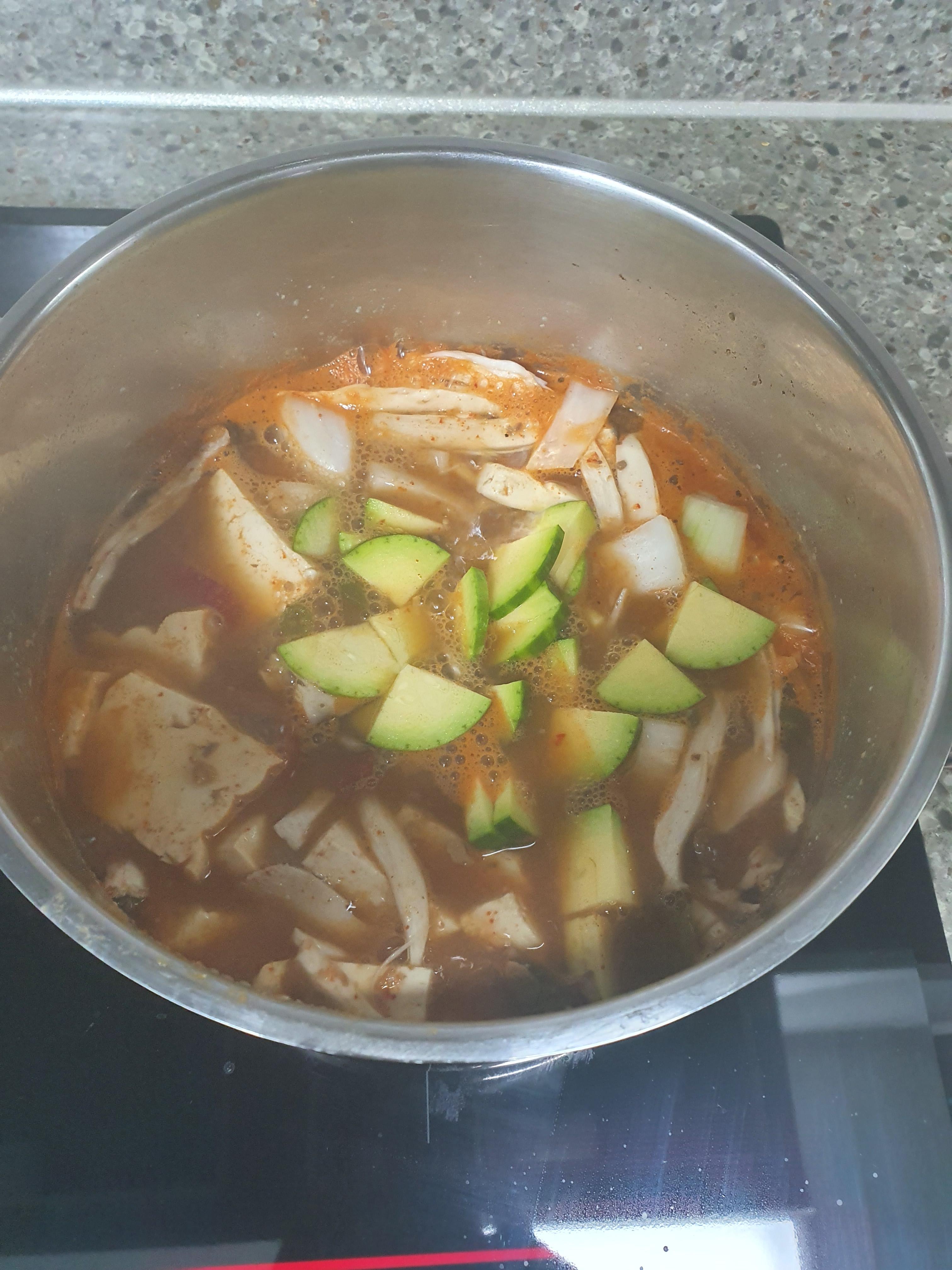 | 재료준비 새송이버섯 1개 / 양파 반개 / 호박 1/3개 / 홍고추 반개 / 청양고추 반개 / 두부 반모 / 된장 / 고추가루 0.5스푼 육수준비 다시팩 / 쌀뜬물 4번째 물 |