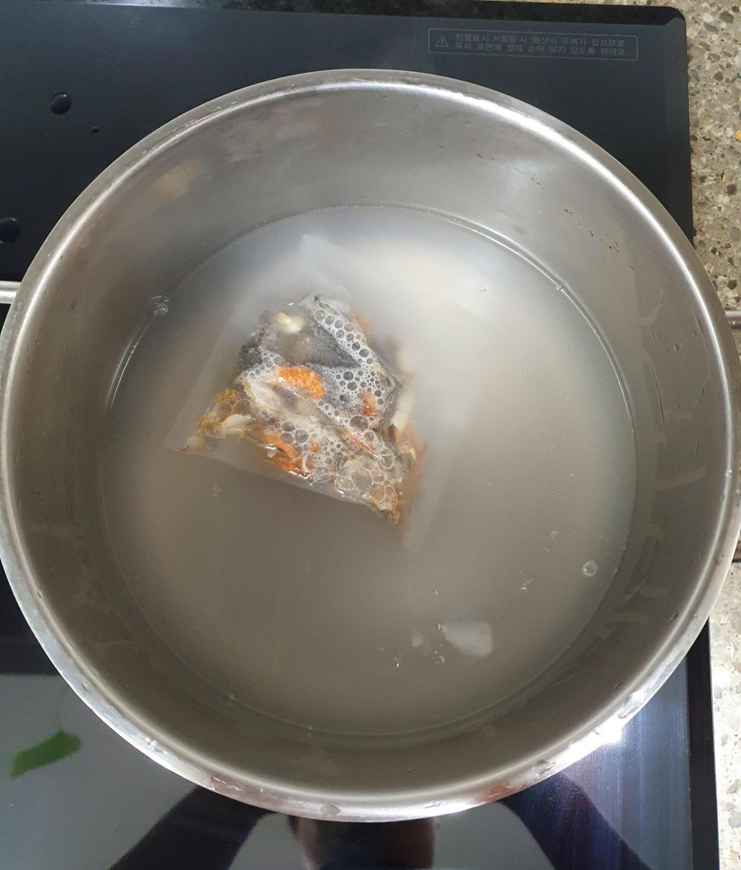 쌀뜬물이 확보가 되면 다시육수를 내기위해 다시육수팩을 넣어 육수를 만들어 주세요. (요즘참 편하게 되어있습니다. 다시팩 안에 멸치 다시마 새우 등등 각종 해산물들이 가득담아서 간편하게 사용할 수 있도록 만들어주니...^^ 천국^^)